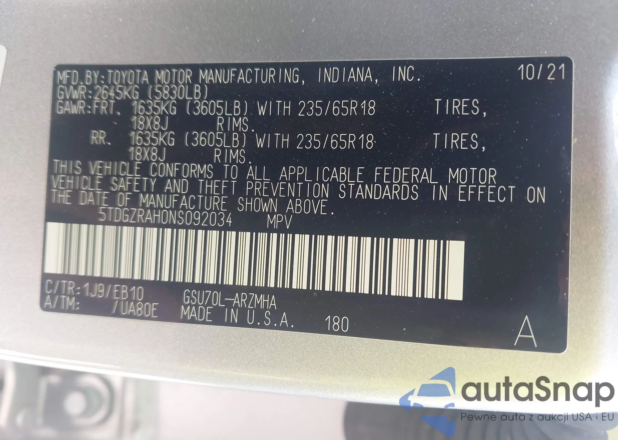 VIN: 5TDGZRAH0NS092034
