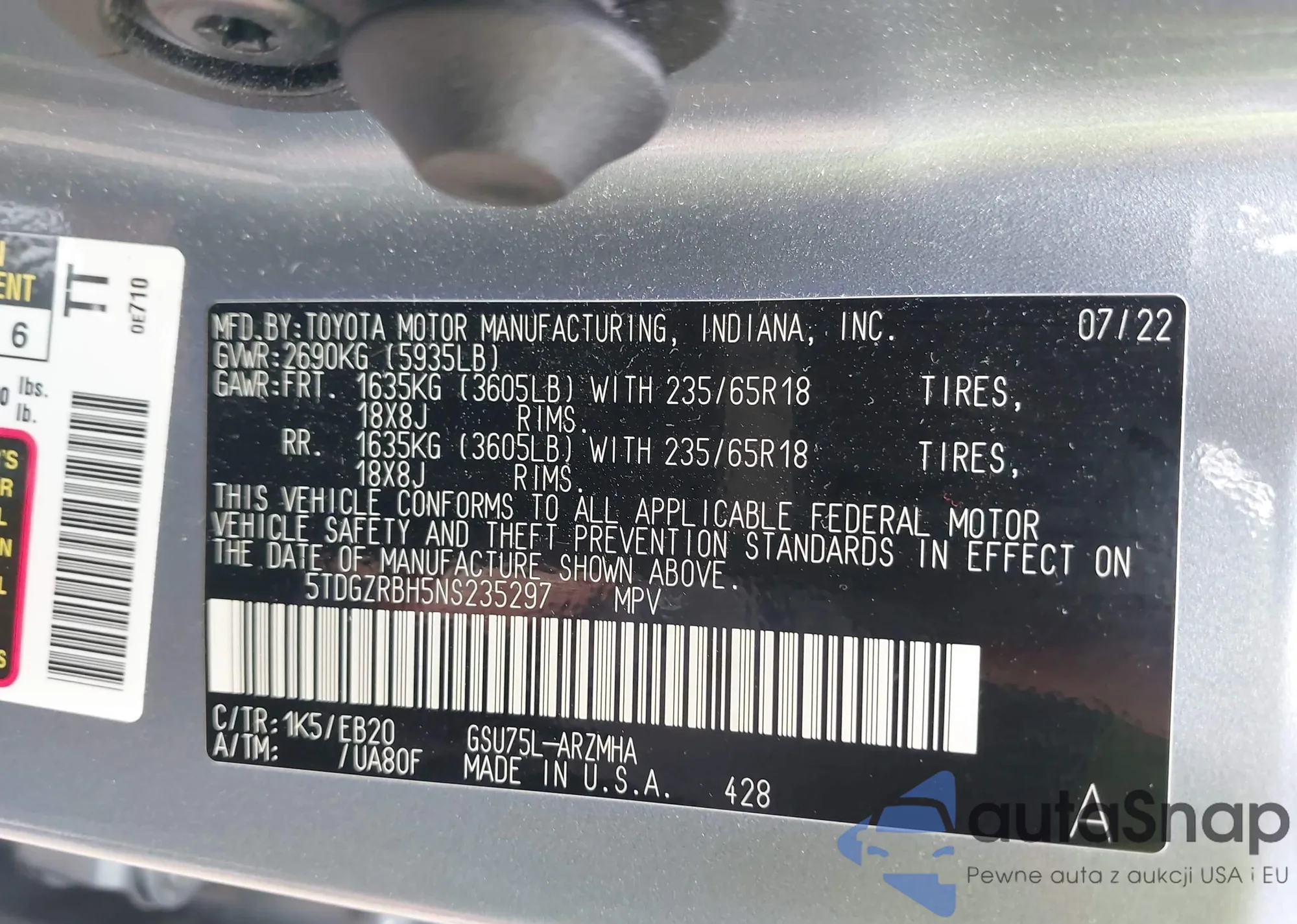 VIN: 5TDGZRBH5NS235297