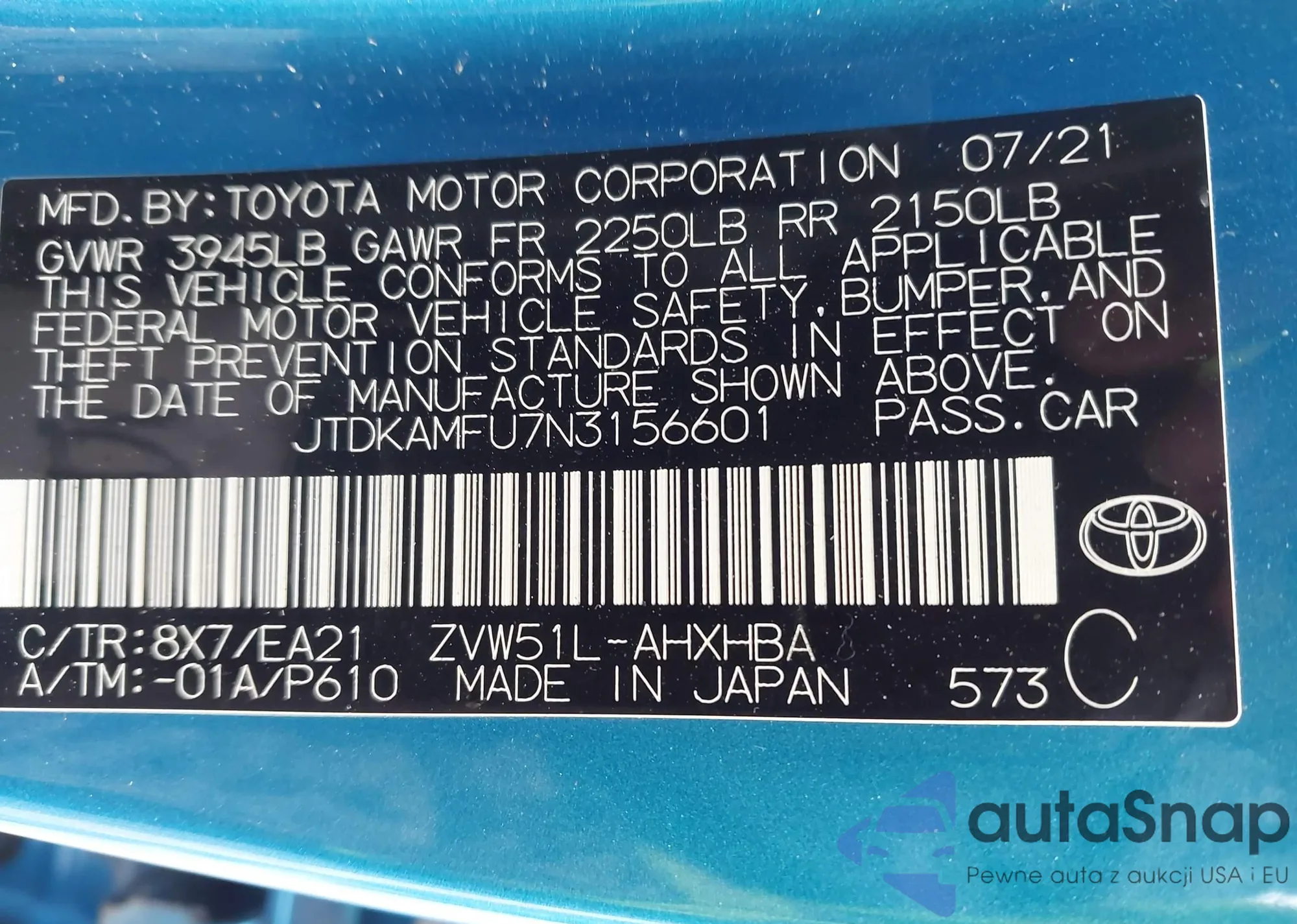 Samochód Toyota Prius 2022 (VIN JTDKAMFU7N3156601) ma dokumenty uniemożliwiające rejestrację. Mogą pojawić się trudności przy eksporcie i rejestracji. Skontaktuj się z ekspertami AutaSnap w celu znalezienia alternatywy.