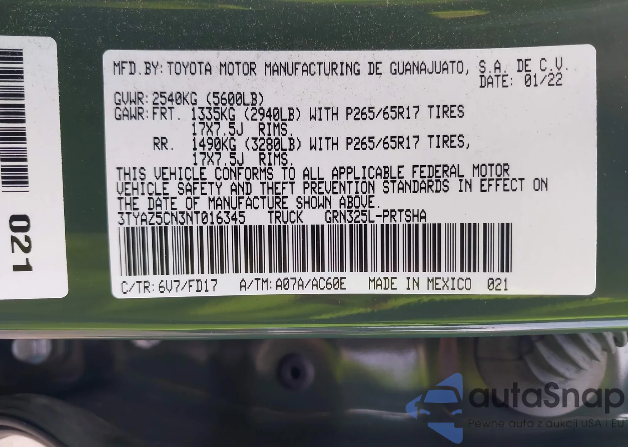 VIN: 3TYAZ5CN3NT016345
