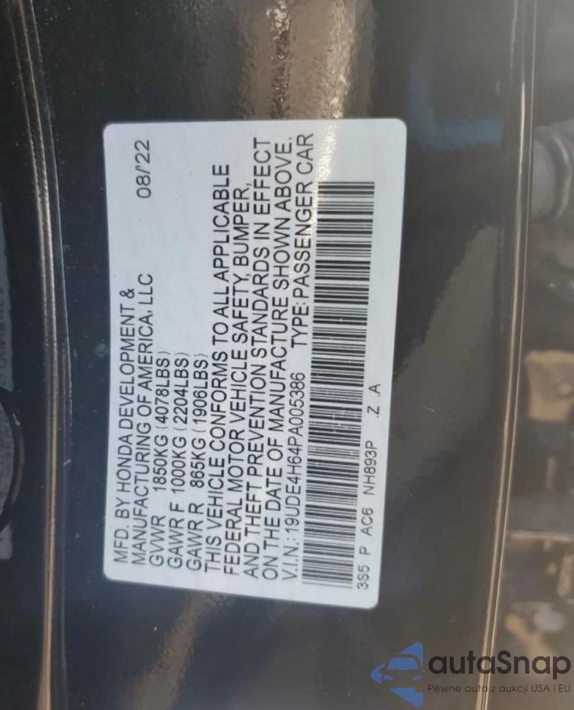 VIN: 19UDE4H64PA005386