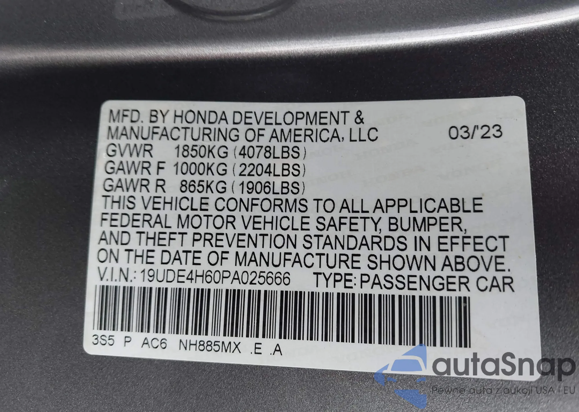 • VIN: 19UDE4H60PA025666