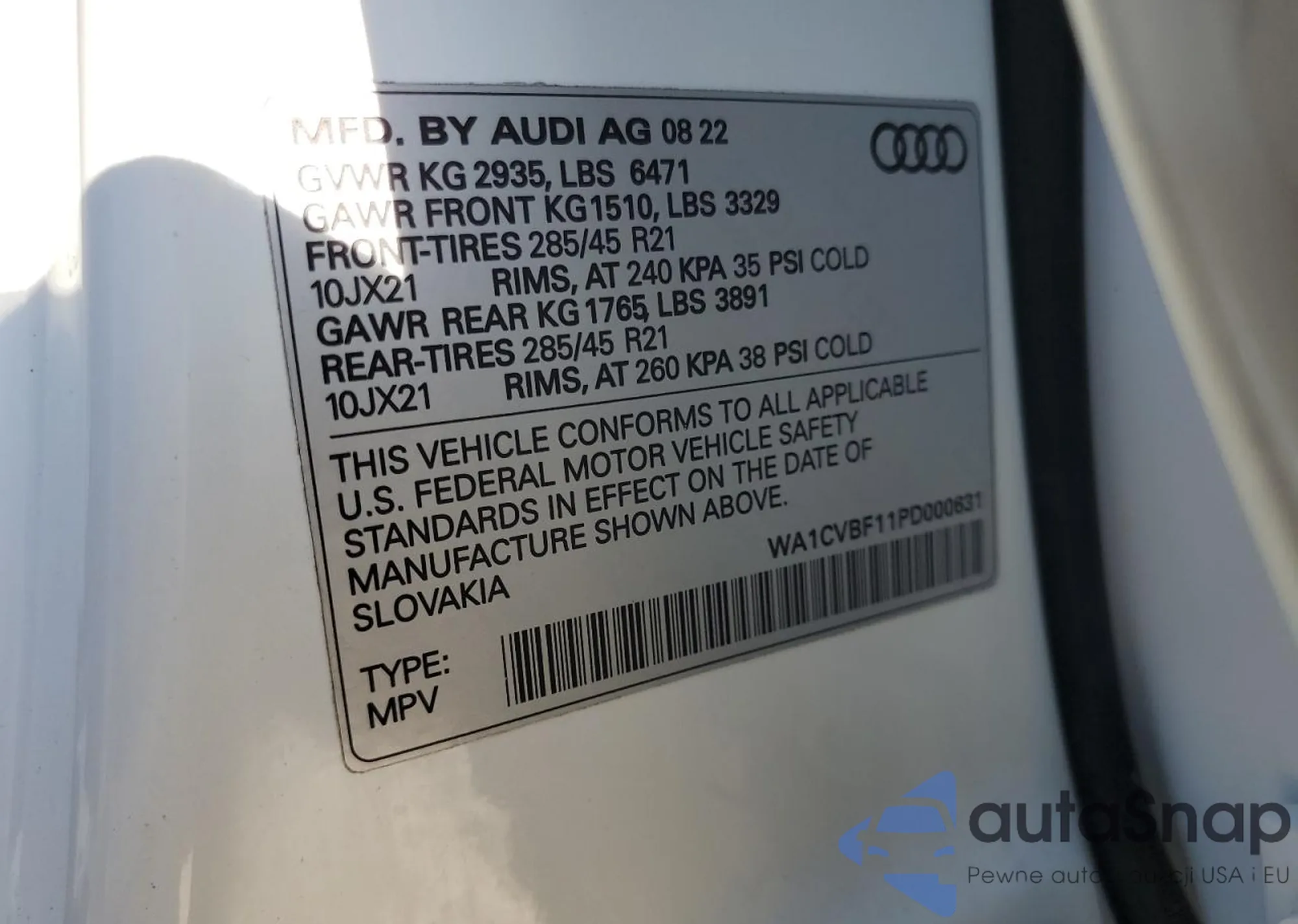 Samochód Audi Q8 2023 (VIN WA1CVBF11PD000631) ma dokumenty uniemożliwiające rejestrację. Mogą pojawić się trudności przy eksporcie i rejestracji. Skontaktuj się z ekspertami AutaSnap w celu znalezienia alternatywy.