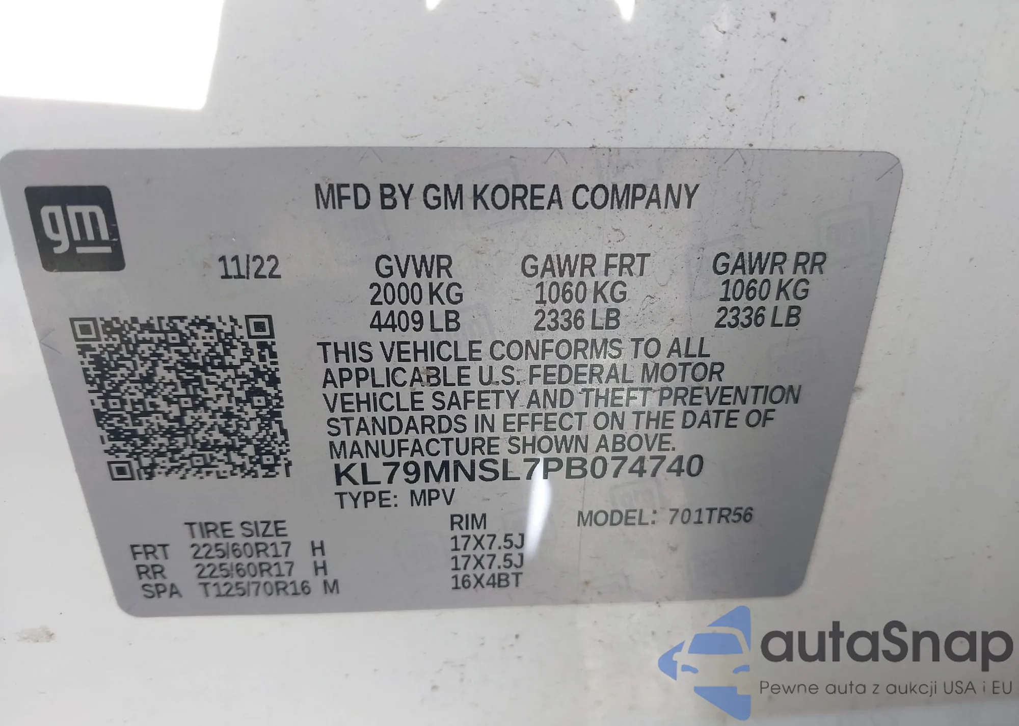 VIN: KL79MNSL7PB074740