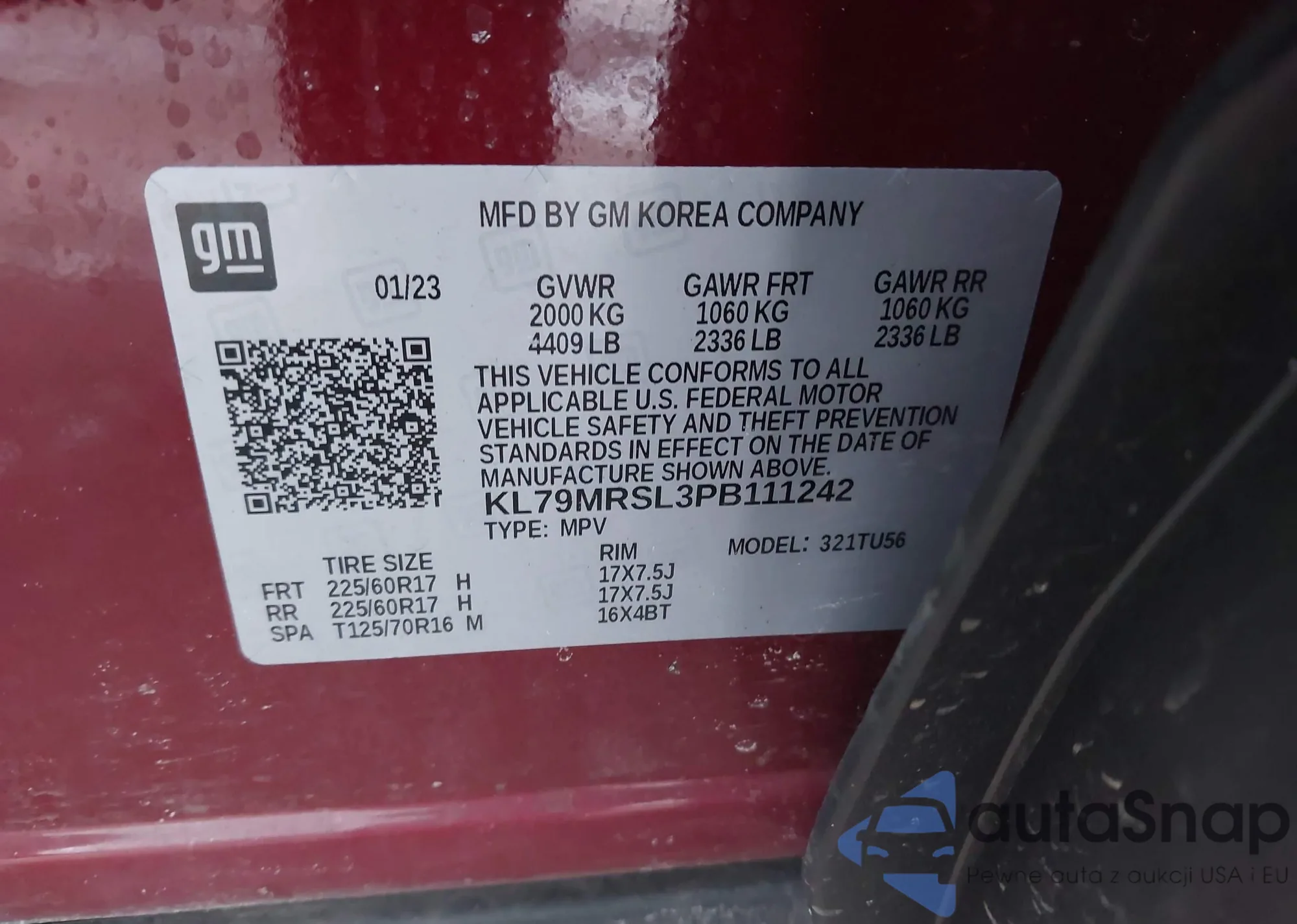 VIN: KL79MRSL3PB111242