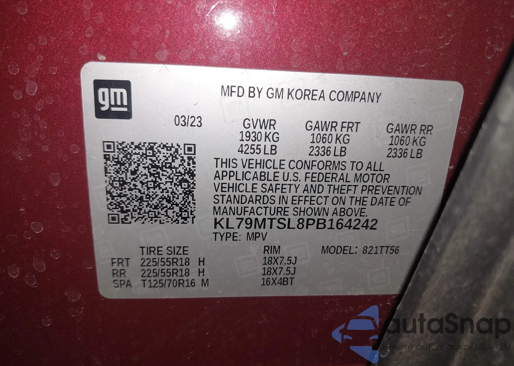 • VIN: KL79MTSL8PB164242