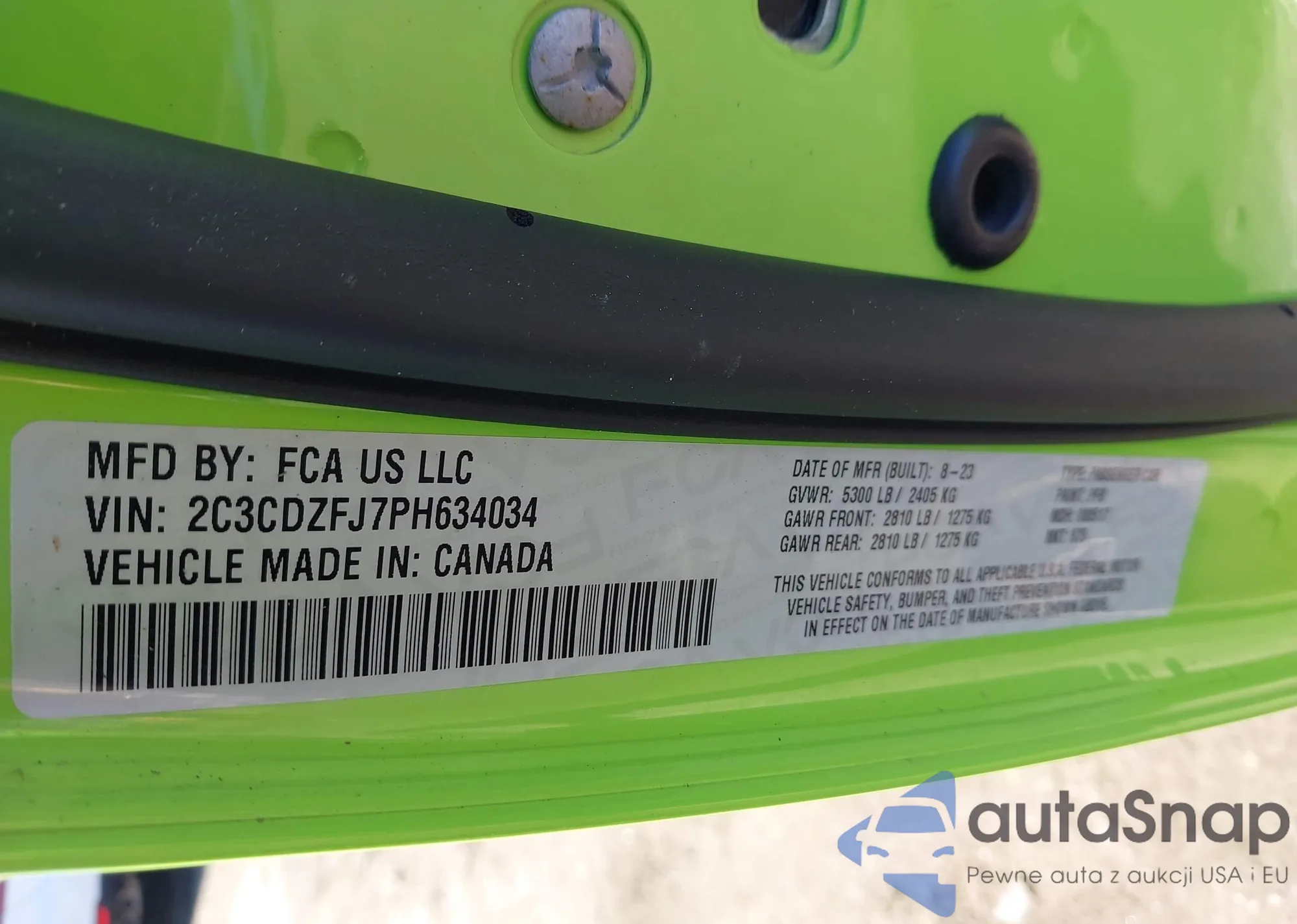 Samochód Dodge Challenger 2023 (VIN 2C3CDZFJ7PH634034) ma dokumenty uniemożliwiające rejestrację. Mogą pojawić się trudności przy eksporcie i rejestracji. Skontaktuj się z ekspertami AutaSnap w celu znalezienia alternatywy.