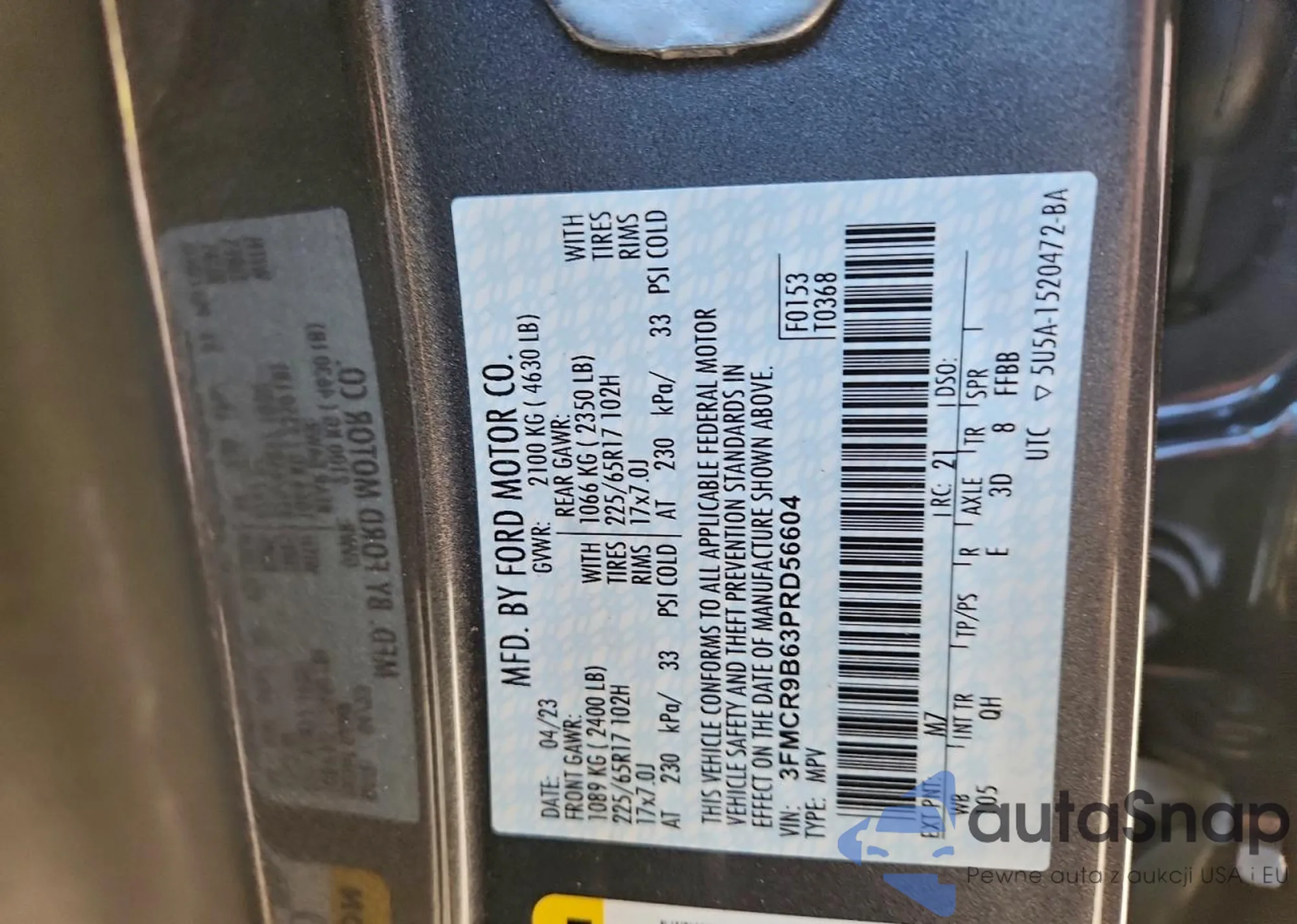 Samochód Ford Bronco Sport 2023 (VIN 3FMCR9B63PRD56604) sprzedaje go niezweryfikowany sprzedawca. Zalecamy raport Carfax i potwierdzenie możliwości rejestracji pojazdu przed zakupem.