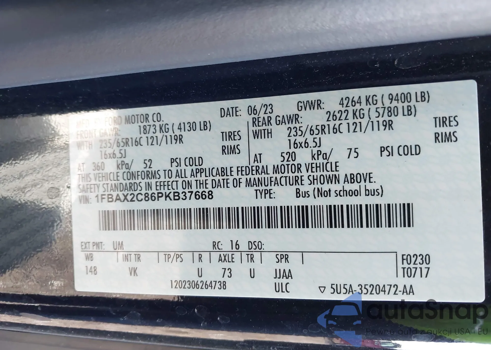 Samochód Ford Transit 2023 (VIN 1FBAX2C86PKB37668) nie był wcześniej licytowany. Dokumenty są czyste, przebieg odpowiada lub jest niższy niż średnia rynku. Sprzedaje go firma ubezpieczeniowa – polecamy zakup. Dostawa do portu zajmie ok. 6–8 tygodni.