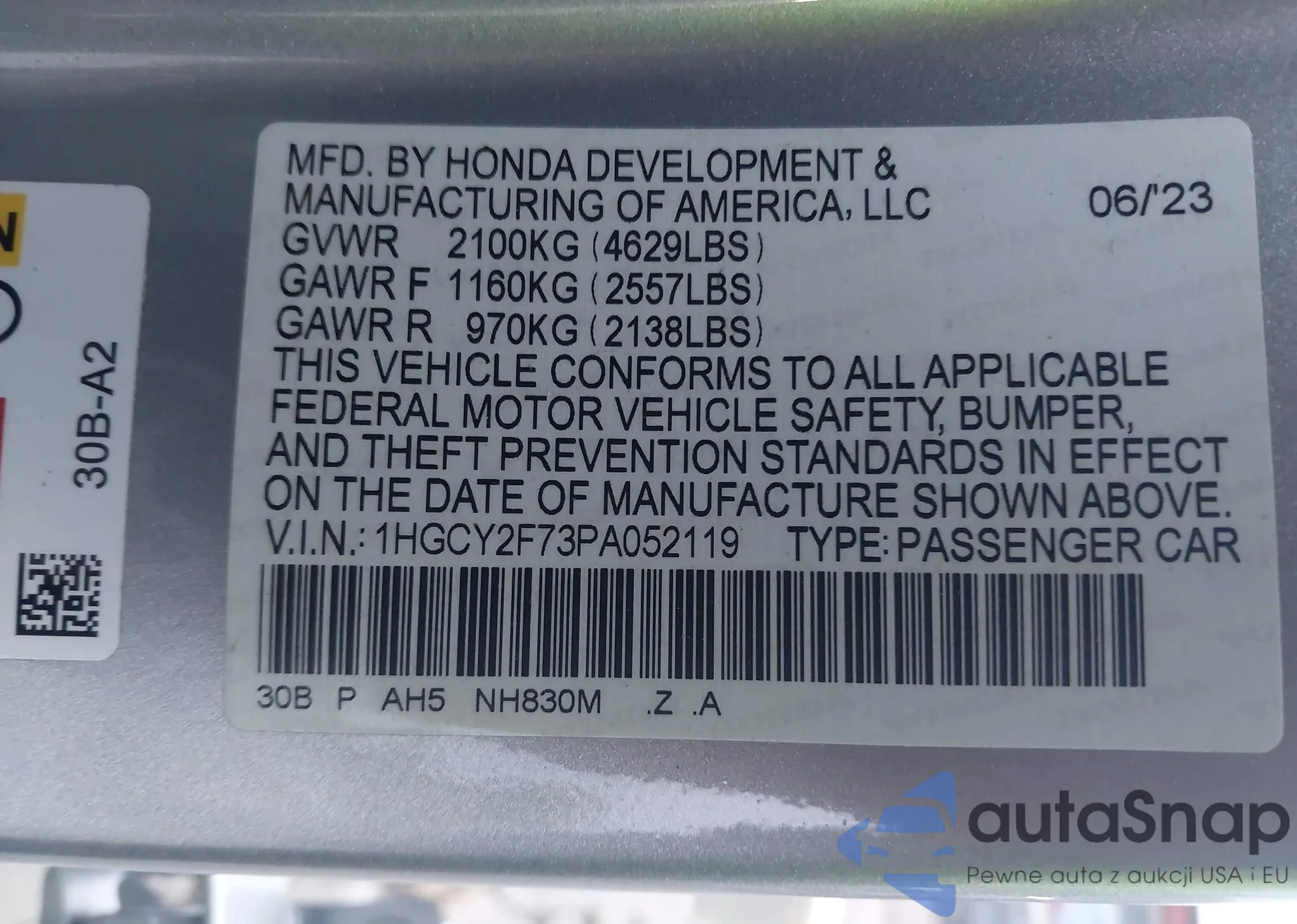 VIN: 1HGCY2F73PA052119