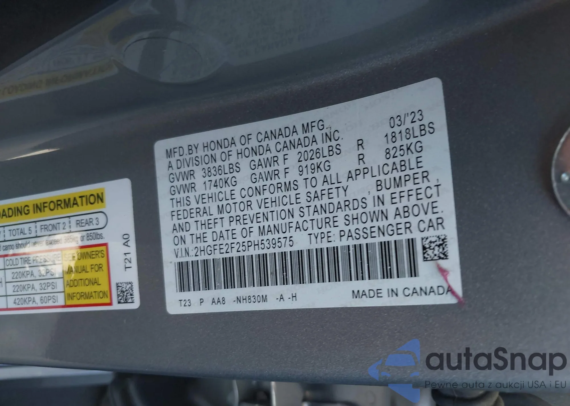• VIN: 2HGFE2F25PH539575