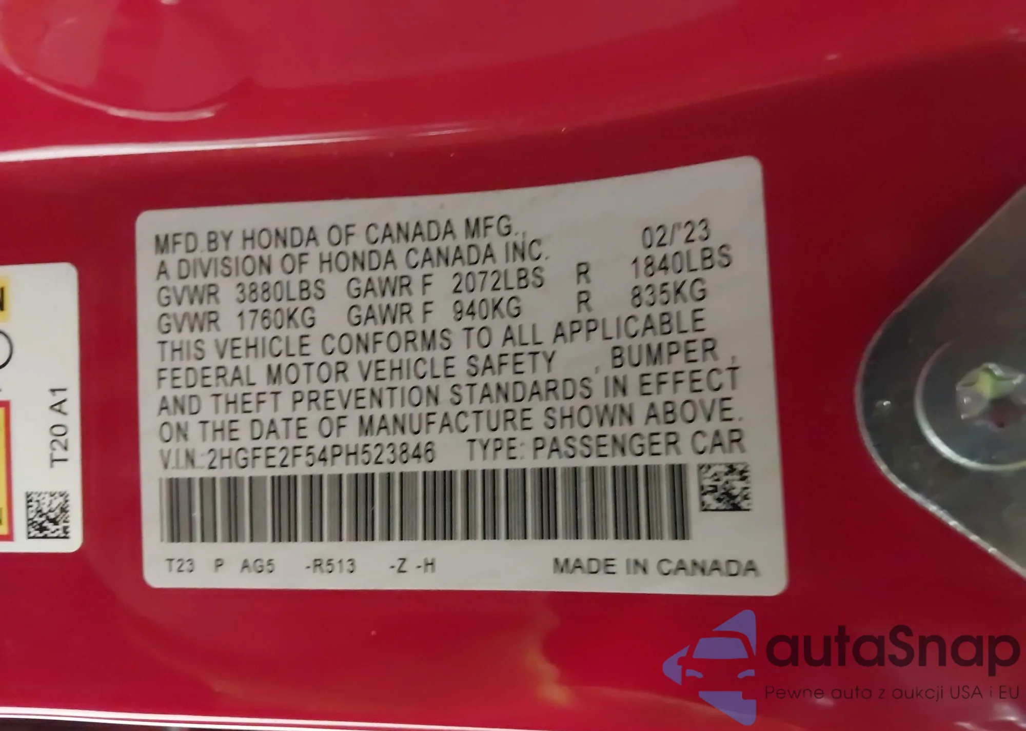 Samochód Honda Civic 2023 (VIN 2HGFE2F54PH523846) nie był wcześniej licytowany. Dokumenty są czyste, przebieg odpowiada lub jest niższy niż średnia rynku. Sprzedaje go firma ubezpieczeniowa – polecamy zakup. Dostawa do portu zajmie ok. 6–8 tygodni.
