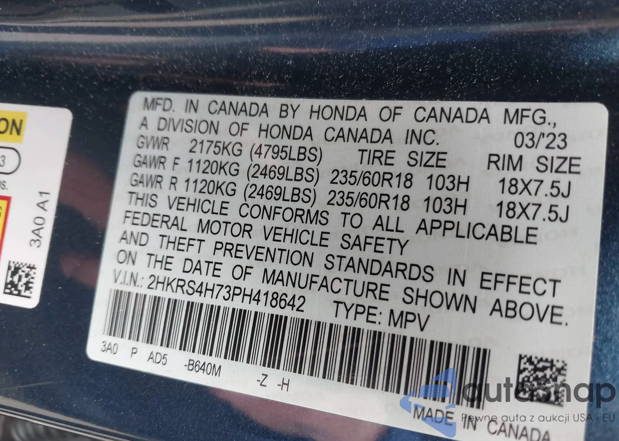 VIN: 2HKRS4H73PH418642