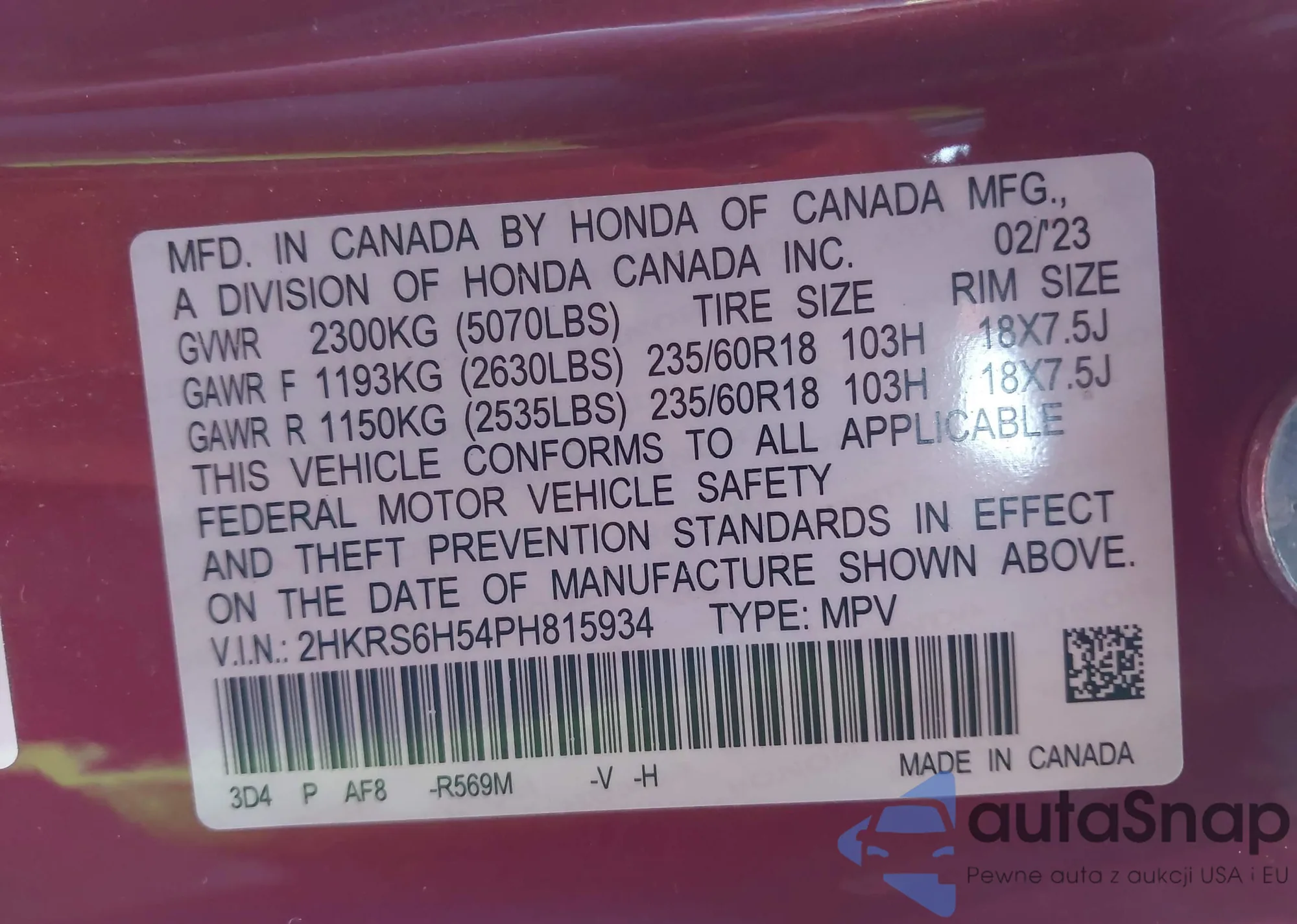 VIN: 2HKRS6H54PH815934