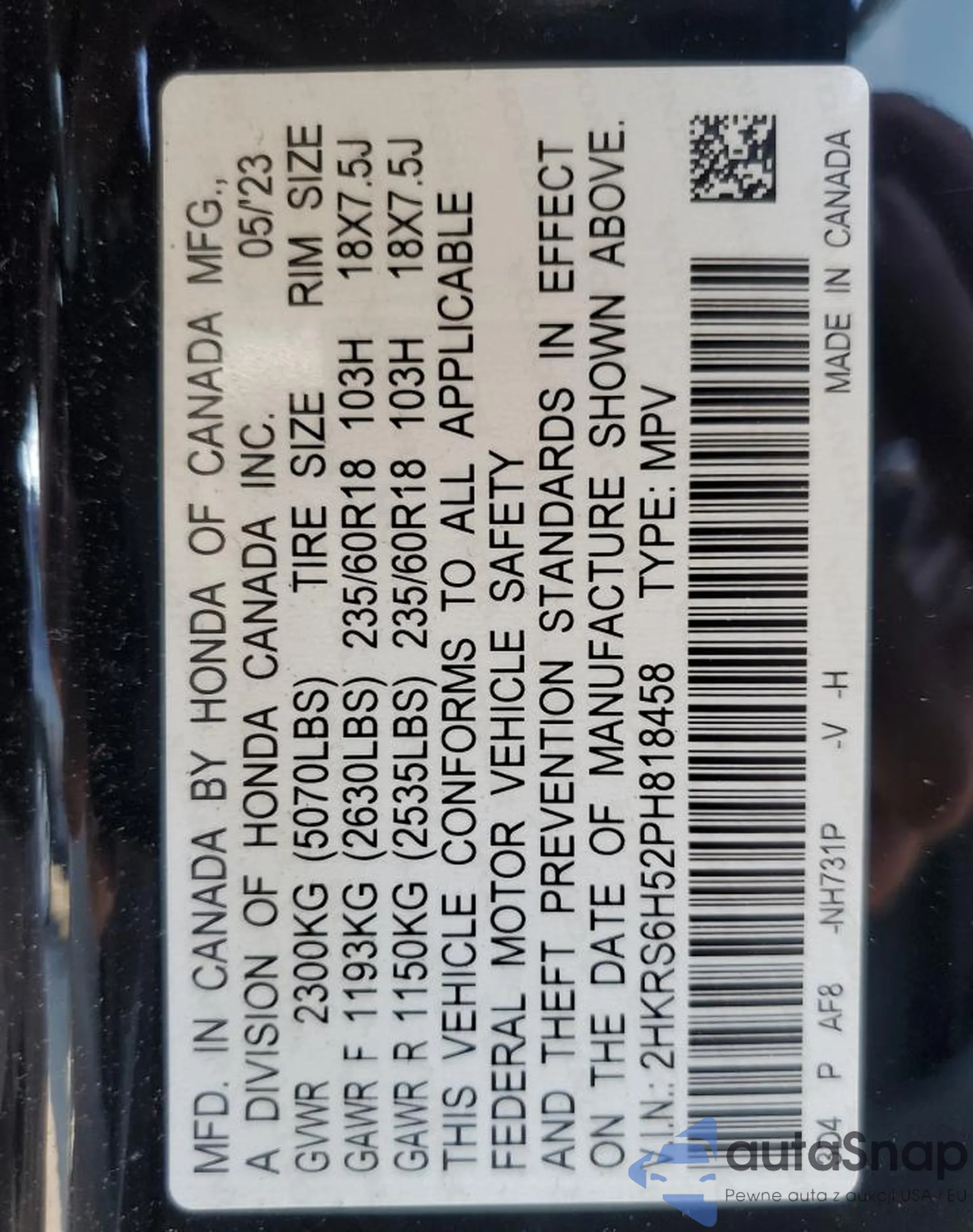 VIN: 2HKRS6H52PH818458
