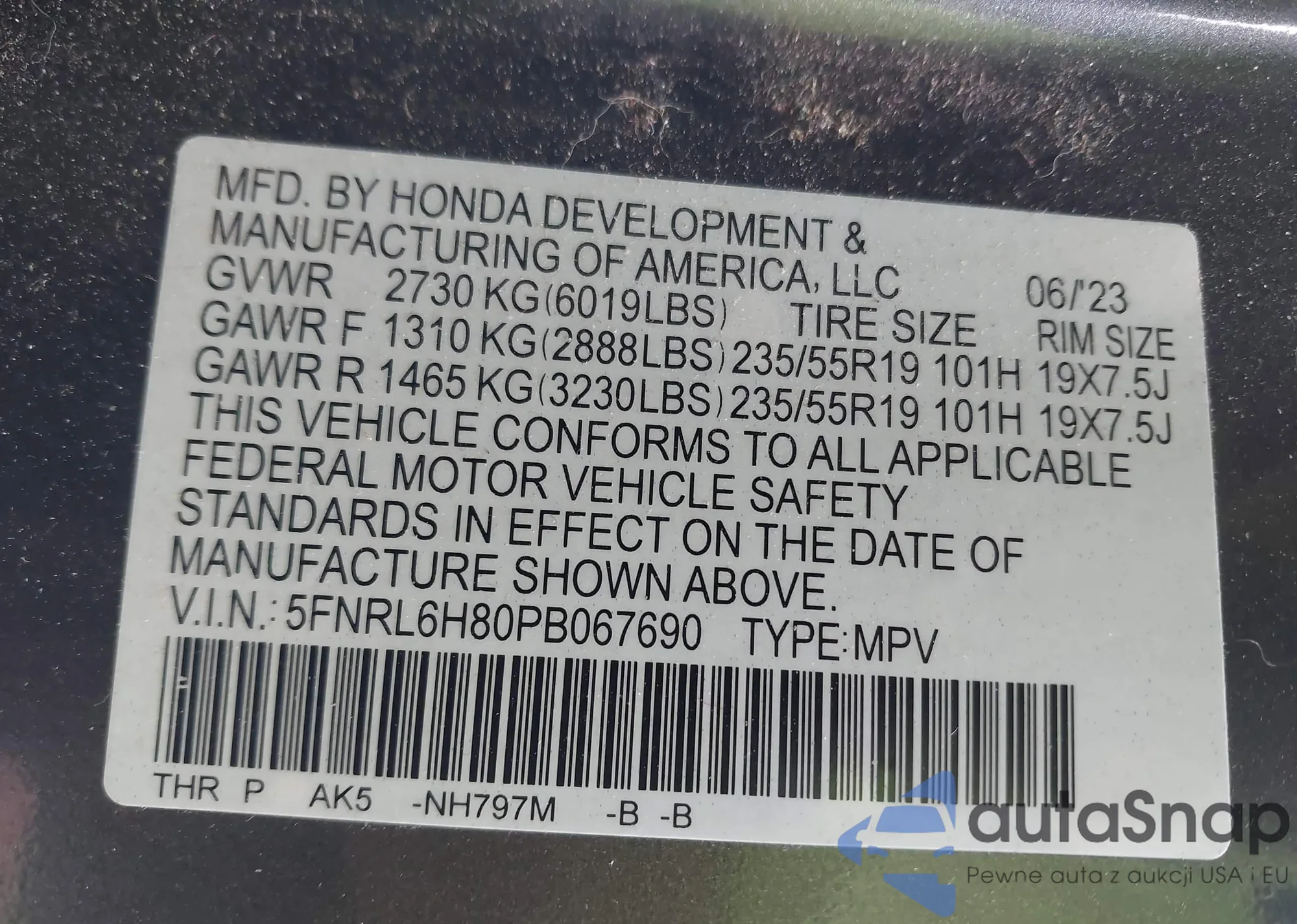 Samochód Honda Odyssey 2023 (VIN 5FNRL6H80PB067690) nie był wcześniej licytowany. Dokumenty są czyste, przebieg odpowiada lub jest niższy niż średnia rynku. Sprzedaje go firma ubezpieczeniowa – polecamy zakup. Dostawa do portu zajmie ok. 6–8 tygodni.