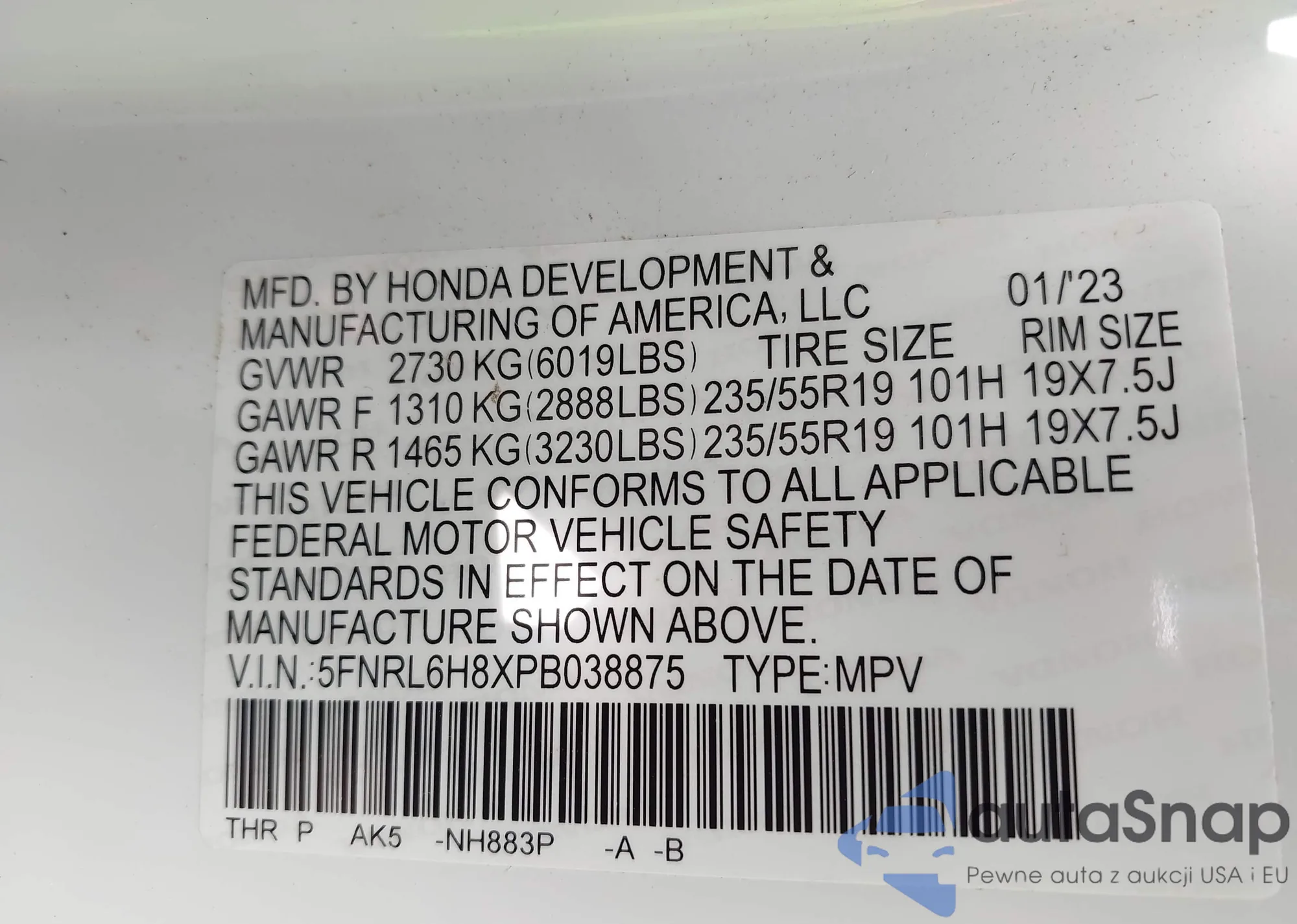 VIN: 5FNRL6H8XPB038875