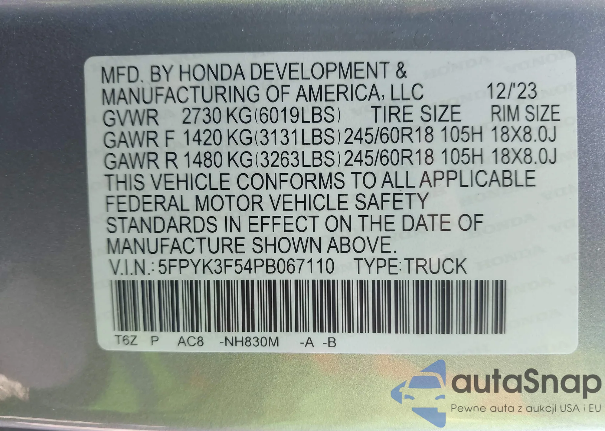 • VIN: 5FPYK3F54PB067110