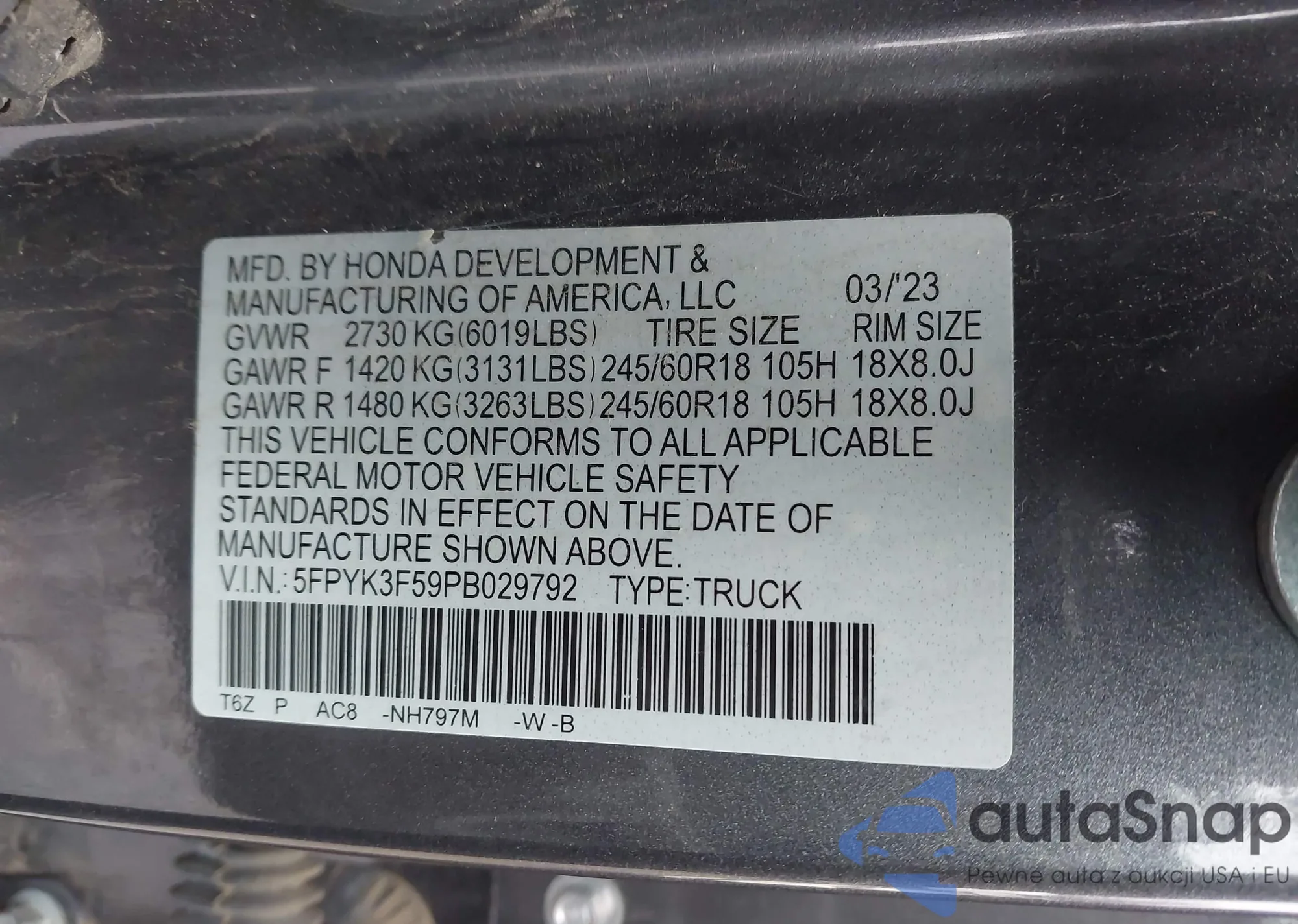VIN: 5FPYK3F59PB029792