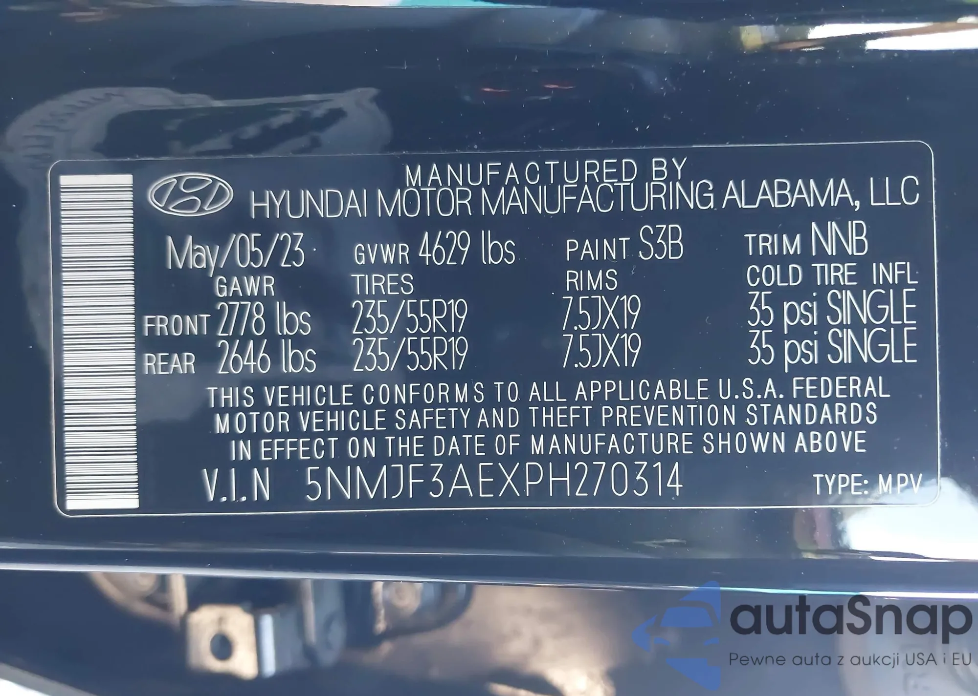 Samochód Hyundai Tucson 2023 (VIN 5NMJF3AEXPH270314) nie był wcześniej licytowany. Dokumenty są czyste, przebieg odpowiada lub jest niższy niż średnia rynku. Sprzedaje go firma ubezpieczeniowa – polecamy zakup. Dostawa do portu zajmie ok. 6–8 tygodni.