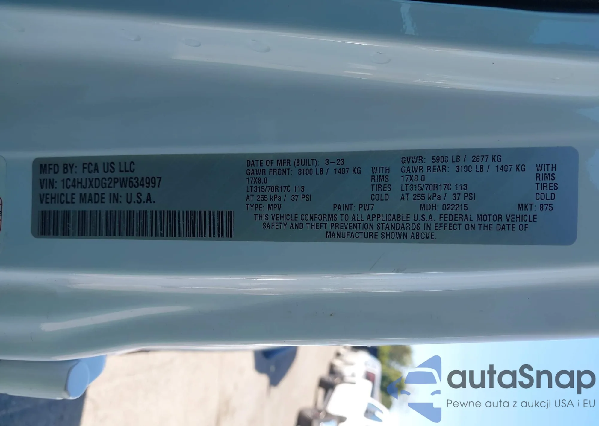 Samochód Jeep Wrangler 2023 (VIN 1C4HJXDG2PW634997) nie był wcześniej licytowany. Dokumenty są czyste, przebieg odpowiada lub jest niższy niż średnia rynku. Sprzedaje go firma ubezpieczeniowa – polecamy zakup. Dostawa do portu zajmie ok. 6–8 tygodni.