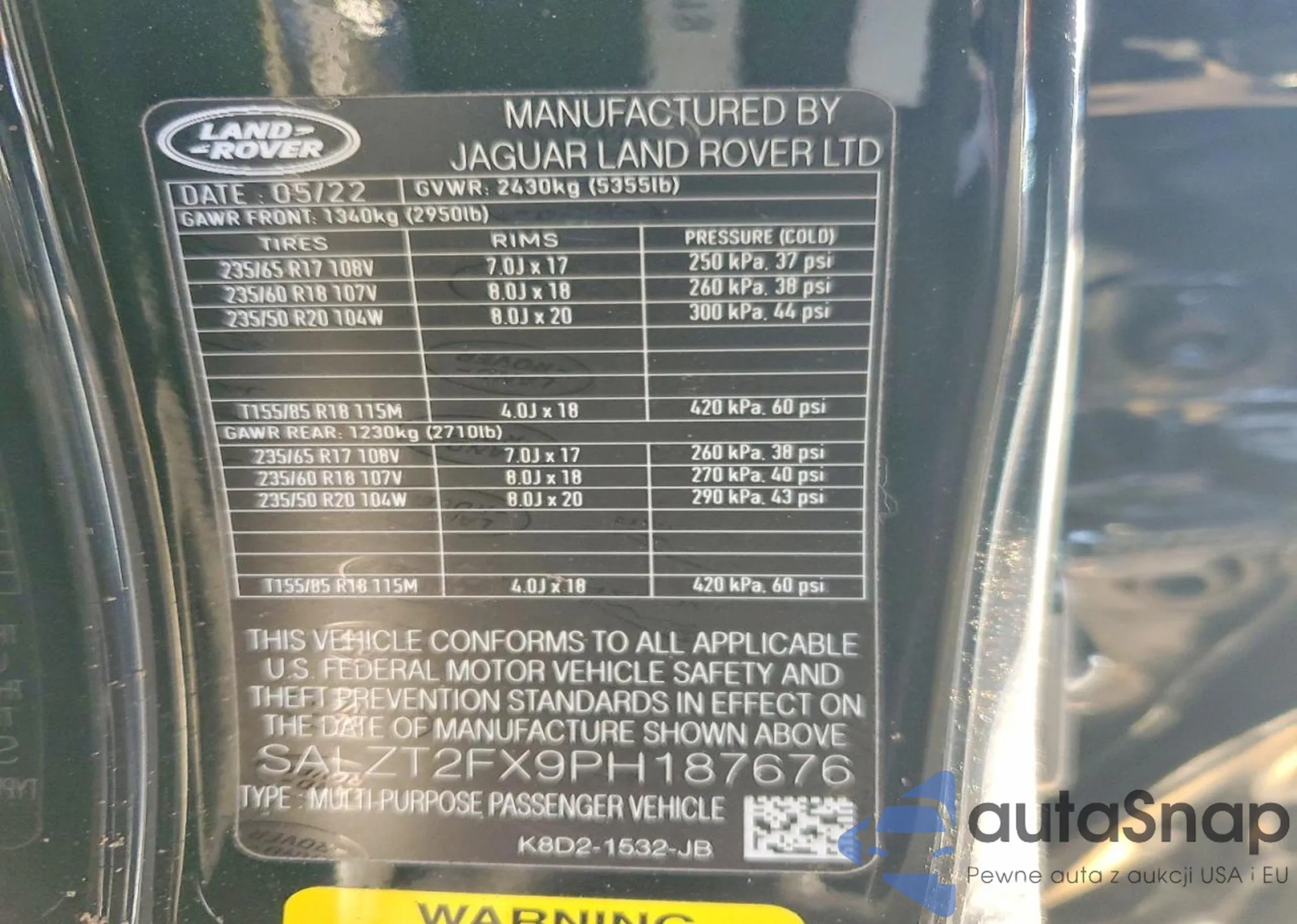 Samochód Land Rover Range Rover Evoque 2023 (VIN SALZT2FX9PH187676) nie był wcześniej licytowany. Dokumenty są czyste, przebieg odpowiada lub jest niższy niż średnia rynku. Sprzedaje go firma ubezpieczeniowa – polecamy zakup. Dostawa do portu zajmie ok. 6–8 tygodni.