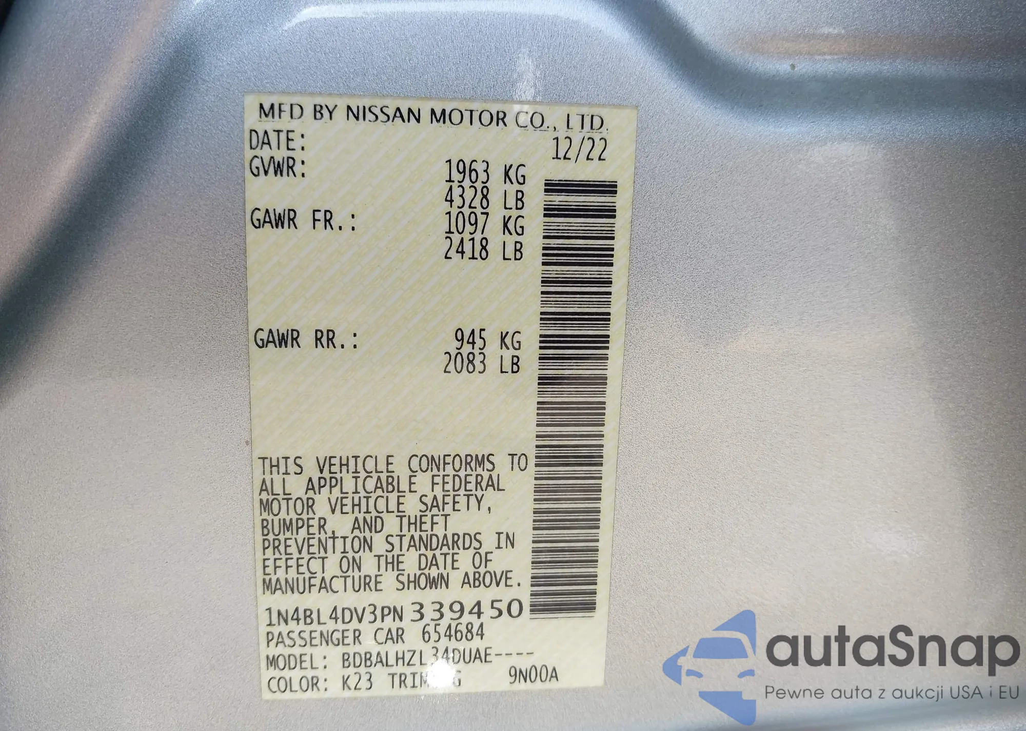 VIN: 1N4BL4DV3PN339450