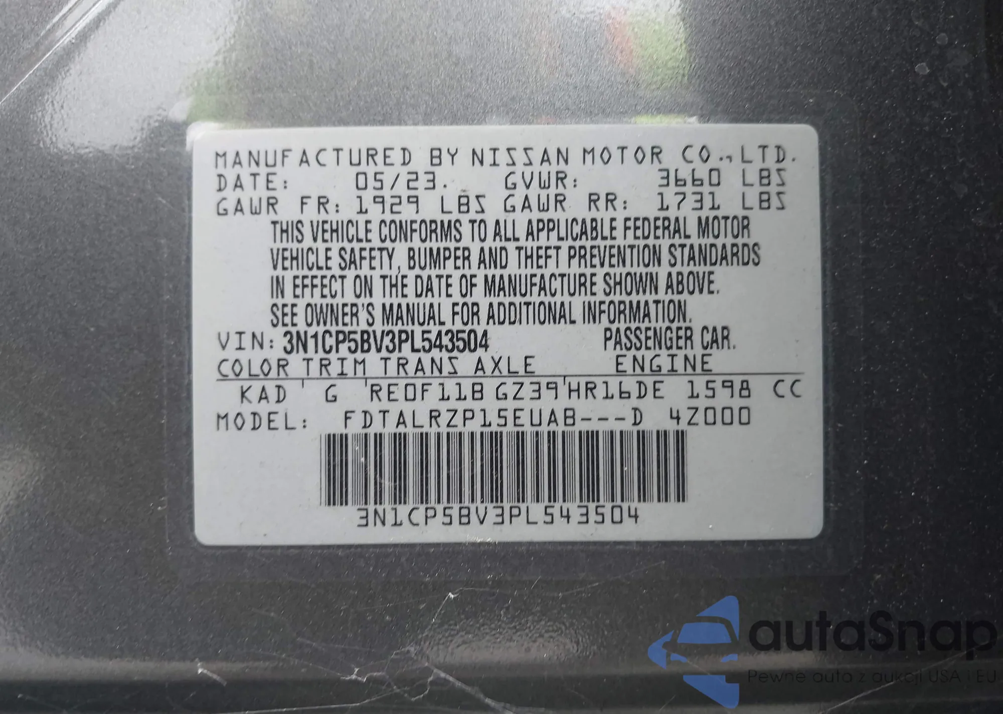VIN: 3N1CP5BV3PL543504