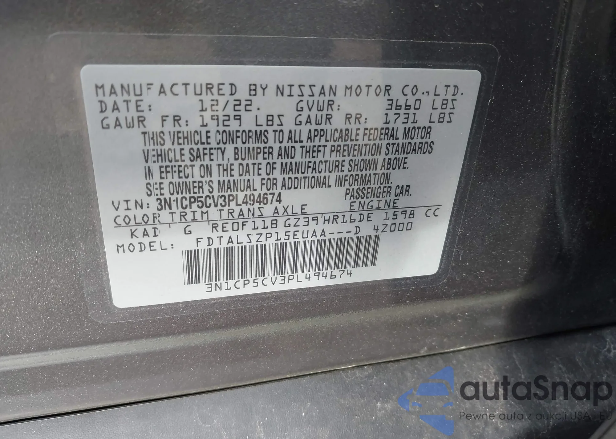 Samochód Nissan Kicks 2023 (VIN 3N1CP5CV3PL494674) nie był wcześniej licytowany. Dokumenty są czyste, przebieg odpowiada lub jest niższy niż średnia rynku. Sprzedaje go firma ubezpieczeniowa – polecamy zakup. Dostawa do portu zajmie ok. 6–8 tygodni.