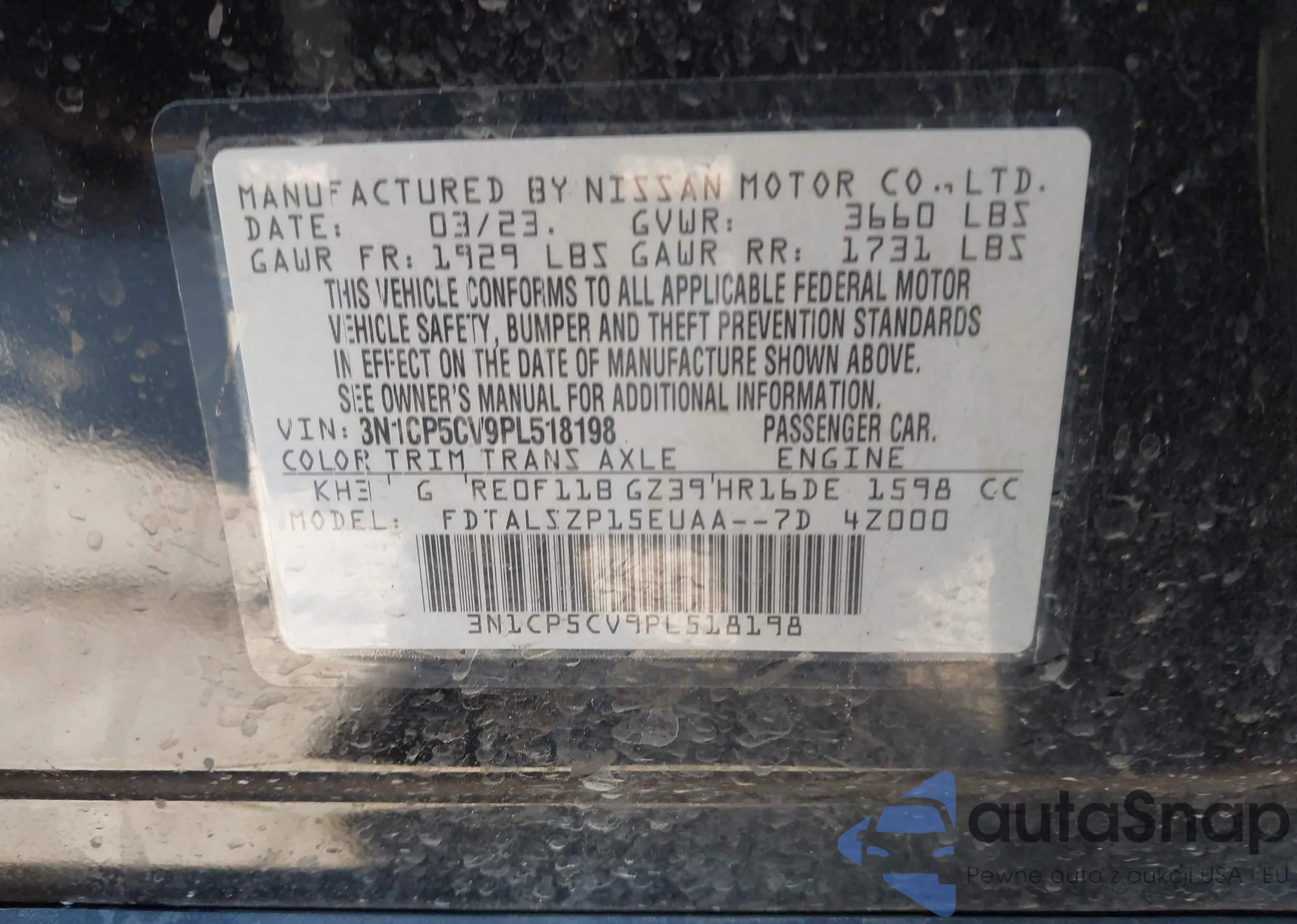 Samochód Nissan Kicks 2023 (VIN 3N1CP5CV9PL518198) nie był wcześniej licytowany. Dokumenty są czyste, przebieg odpowiada lub jest niższy niż średnia rynku. Sprzedaje go firma ubezpieczeniowa – polecamy zakup. Dostawa do portu zajmie ok. 6–8 tygodni.