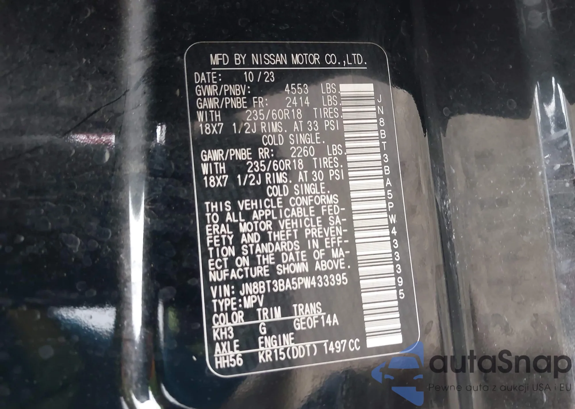 Samochód Nissan Rogue 2023 (VIN JN8BT3BA5PW433395) nie był wcześniej licytowany. Dokumenty są czyste, przebieg odpowiada lub jest niższy niż średnia rynku. Sprzedaje go firma ubezpieczeniowa – polecamy zakup. Dostawa do portu zajmie ok. 6–8 tygodni.