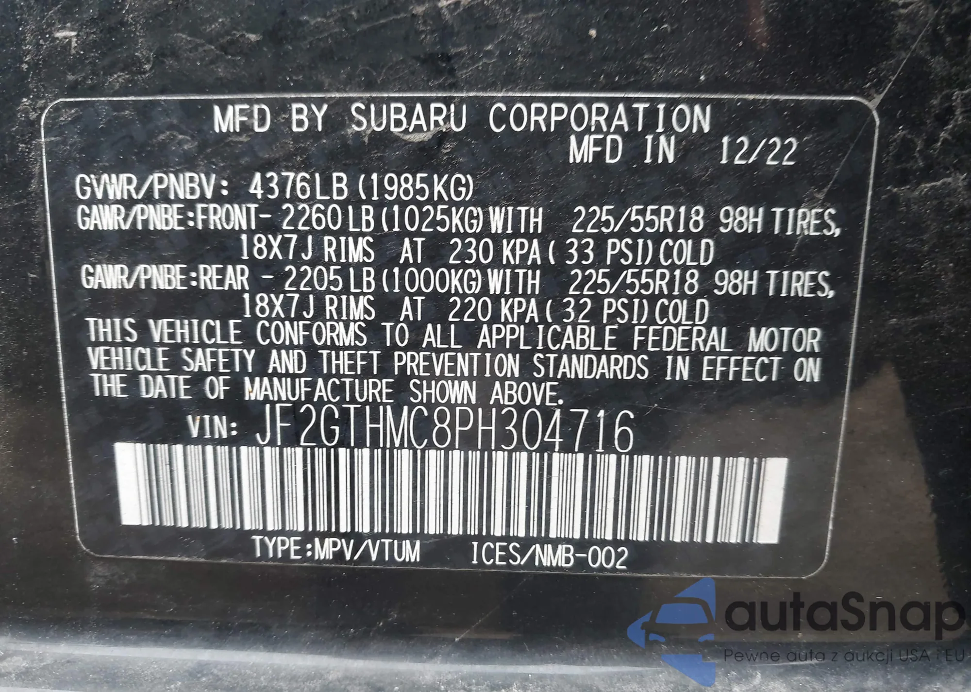 VIN: JF2GTHMC8PH304716