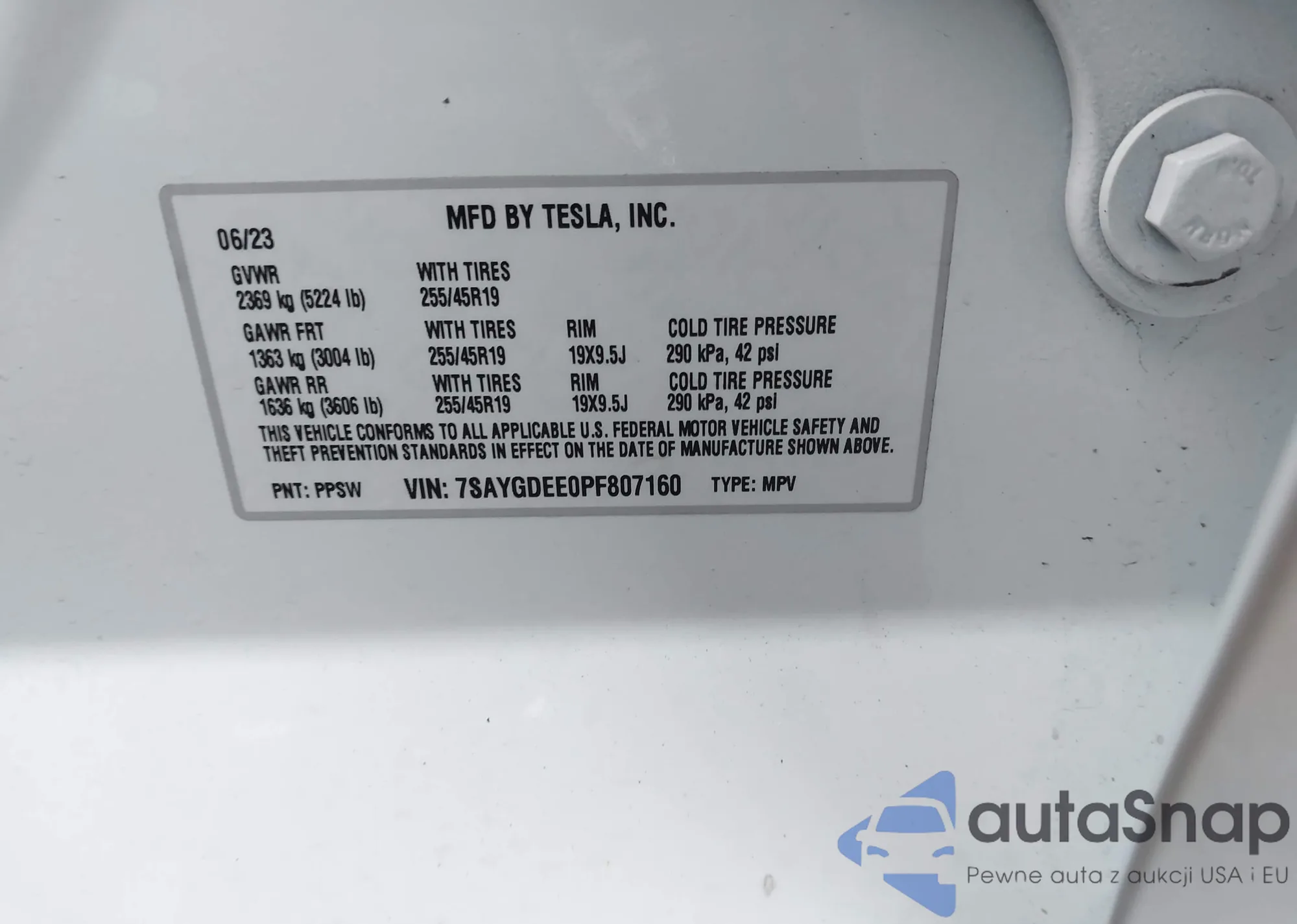 Samochód Tesla Model Y 2023 (VIN 7SAYGDEE0PF807160) nie był wcześniej licytowany. Dokumenty są czyste, przebieg odpowiada lub jest niższy niż średnia rynku. Sprzedaje go firma ubezpieczeniowa – polecamy zakup. Dostawa do portu zajmie ok. 6–8 tygodni.