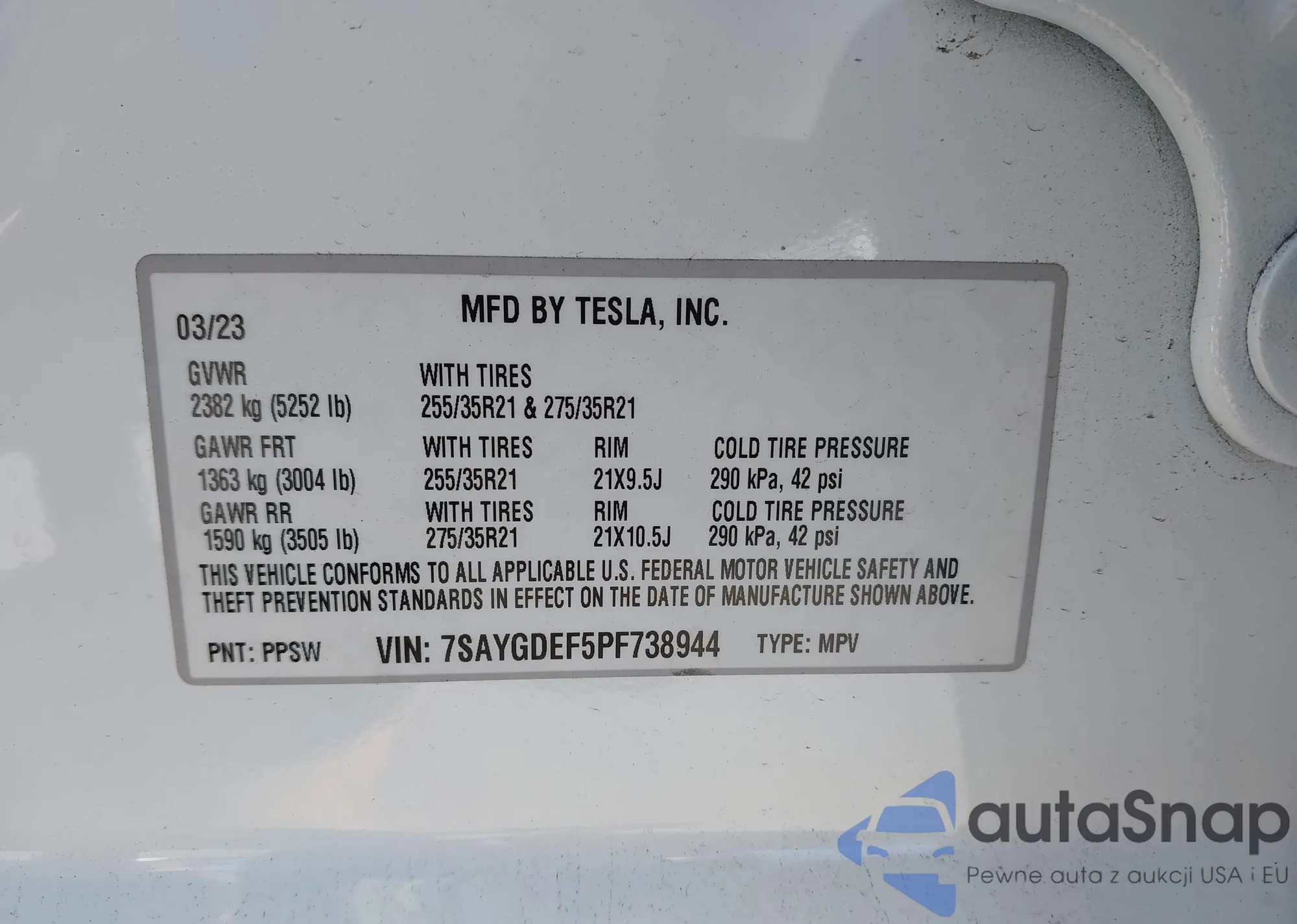 Samochód Tesla Model Y 2023 (VIN 7SAYGDEF5PF738944) nie był wcześniej licytowany. Dokumenty są czyste, przebieg odpowiada lub jest niższy niż średnia rynku. Sprzedaje go firma ubezpieczeniowa – polecamy zakup. Dostawa do portu zajmie ok. 6–8 tygodni.