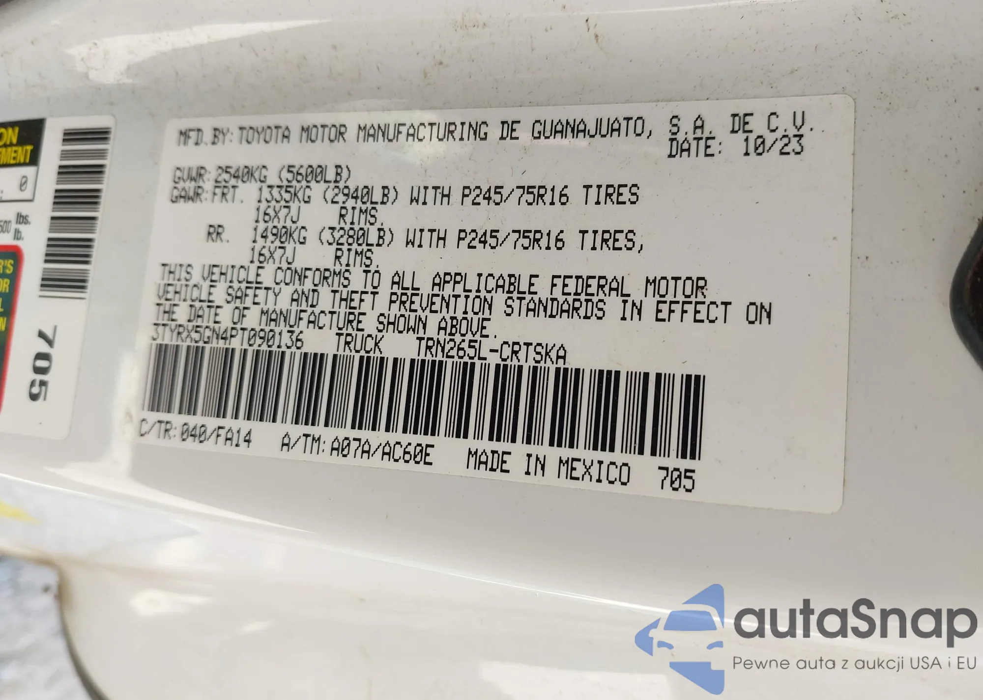 VIN: 3TYRX5GN4PT090136