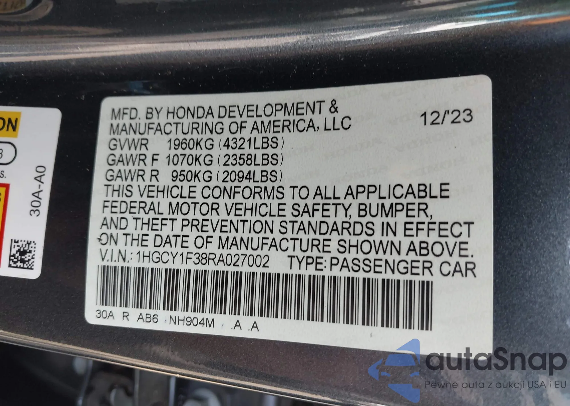 • VIN: 1HGCY1F38RA027002