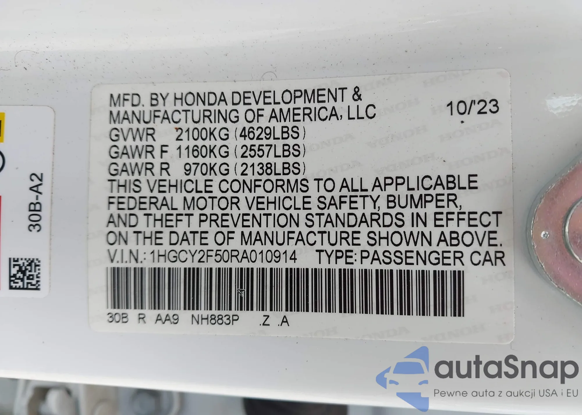 VIN: 1HGCY2F50RA010914