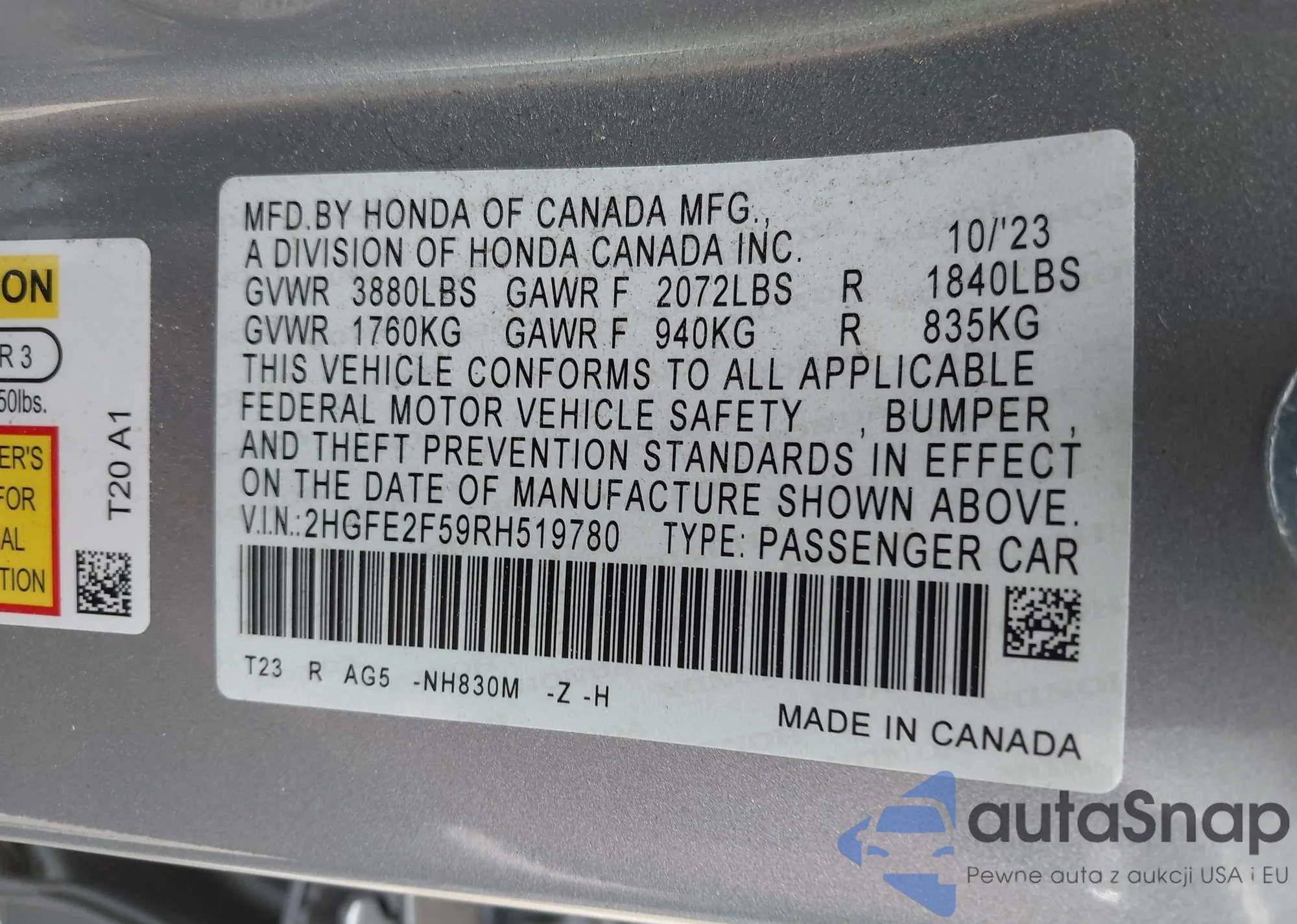 VIN: 2HGFE2F59RH519780