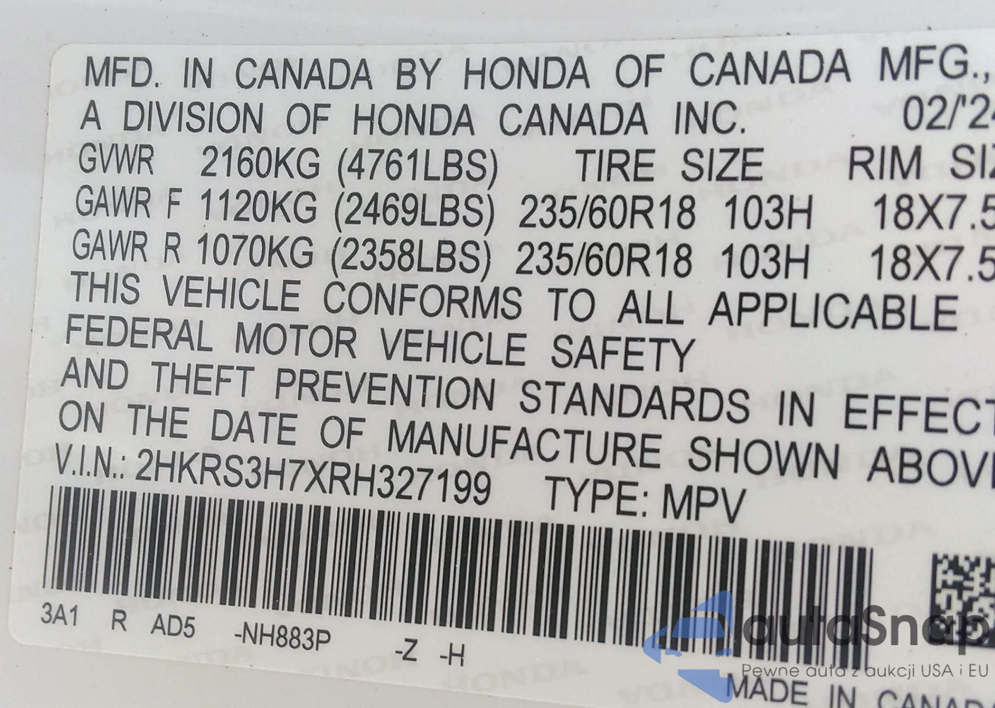 VIN: 2HKRS3H7XRH327199