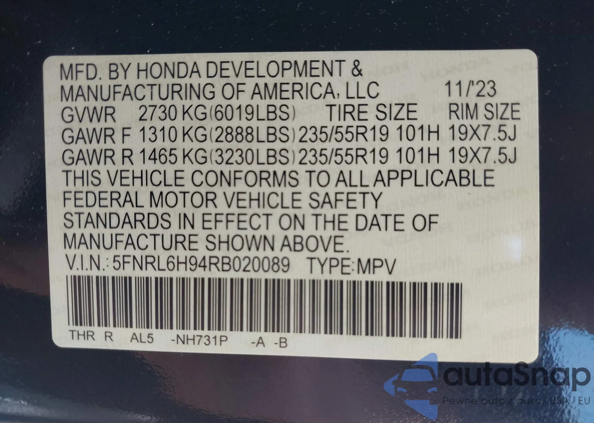 VIN: 5FNRL6H94RB020089