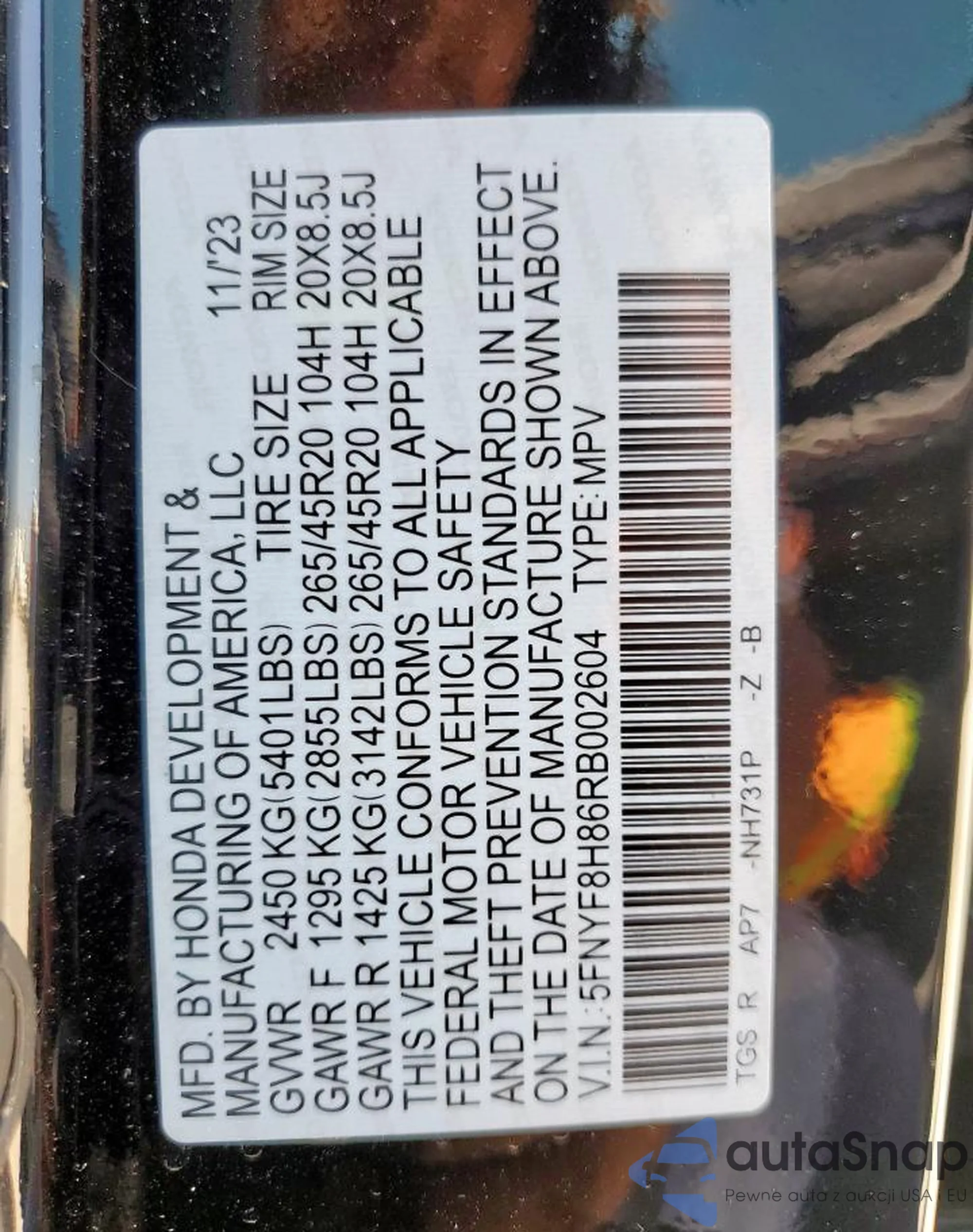 VIN: 5FNYF8H86RB002604