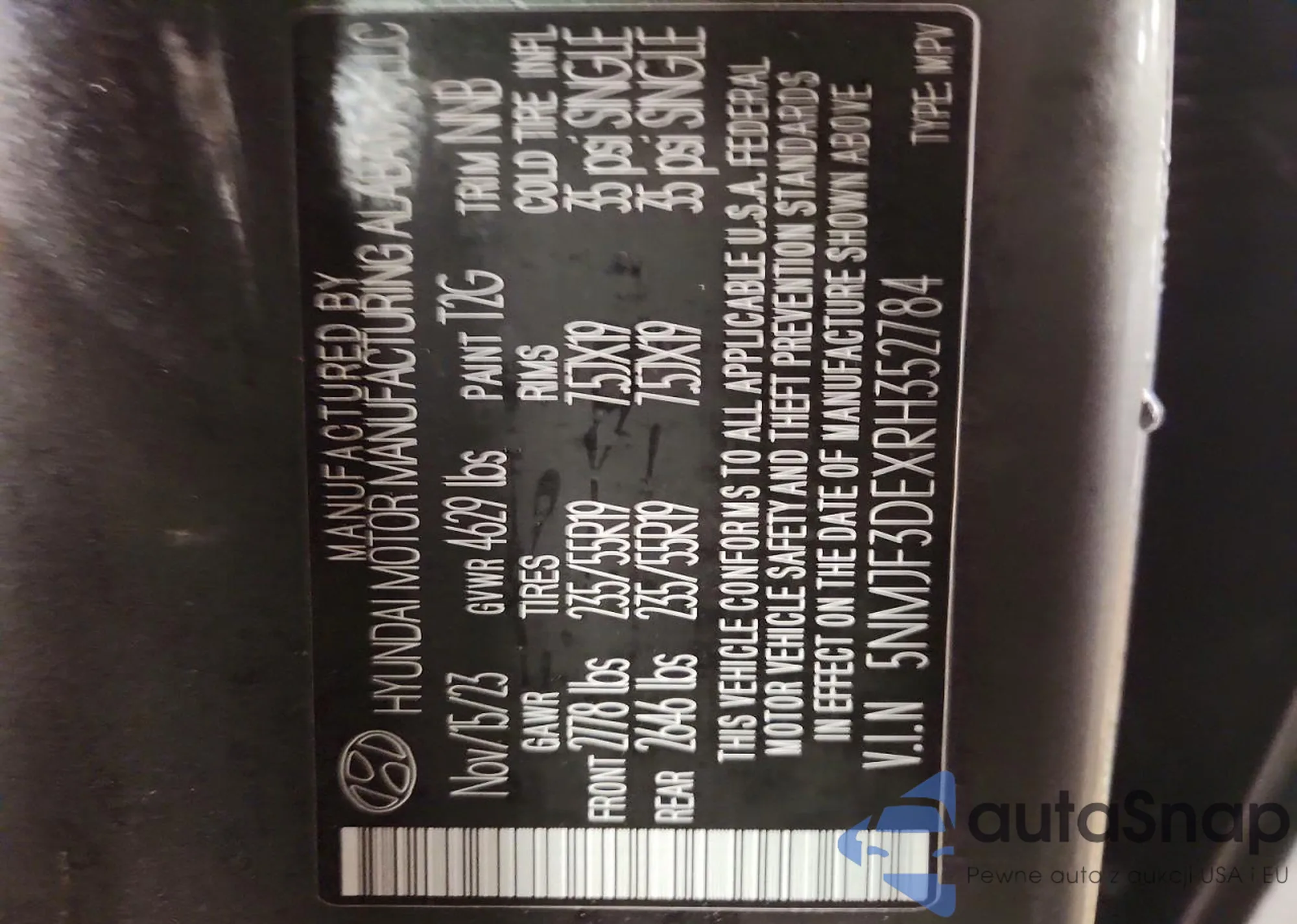 • VIN: 5NMJF3DEXRH352784