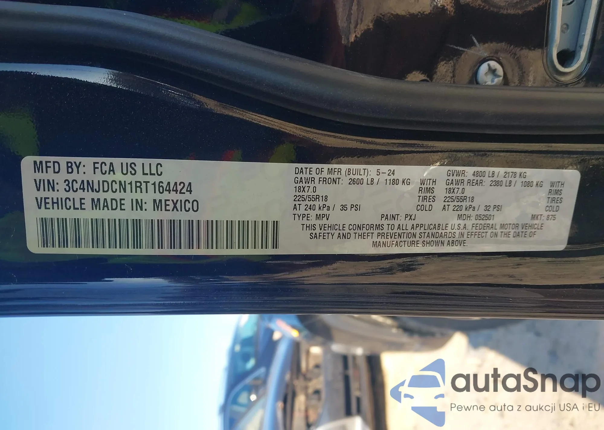 Samochód Jeep Compass 2024 (VIN 3C4NJDCN1RT164424) nie był wcześniej licytowany. Dokumenty są czyste, przebieg odpowiada lub jest niższy niż średnia rynku. Sprzedaje go firma ubezpieczeniowa – polecamy zakup. Dostawa do portu zajmie ok. 6–8 tygodni.