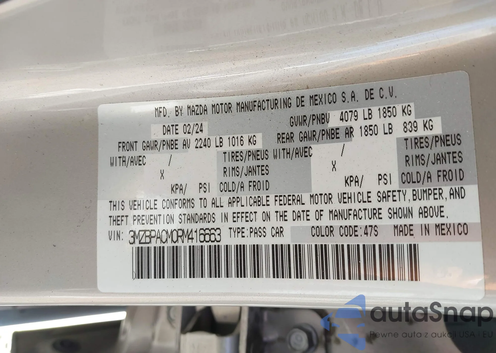 Samochód Mazda 3 2024 (VIN 3MZBPACM0RM416663) nie był wcześniej licytowany. Dokumenty są czyste, przebieg odpowiada lub jest niższy niż średnia rynku. Sprzedaje go firma ubezpieczeniowa – polecamy zakup. Dostawa do portu zajmie ok. 6–8 tygodni.