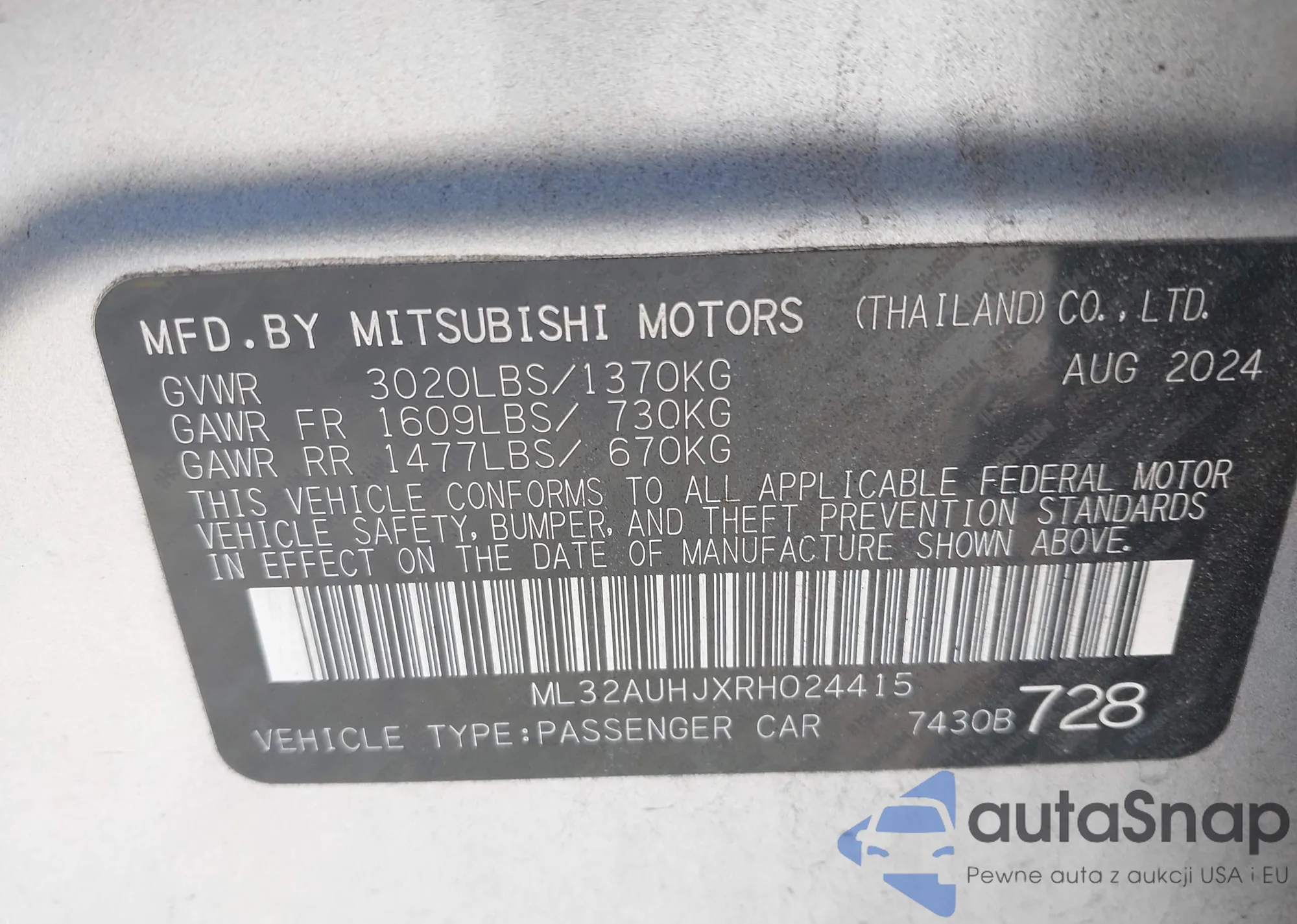 Samochód Mitsubishi Mirage 2024 (VIN ML32AUHJXRH024415) ma dokumenty uniemożliwiające rejestrację. Mogą pojawić się trudności przy eksporcie i rejestracji. Skontaktuj się z ekspertami AutaSnap w celu znalezienia alternatywy.