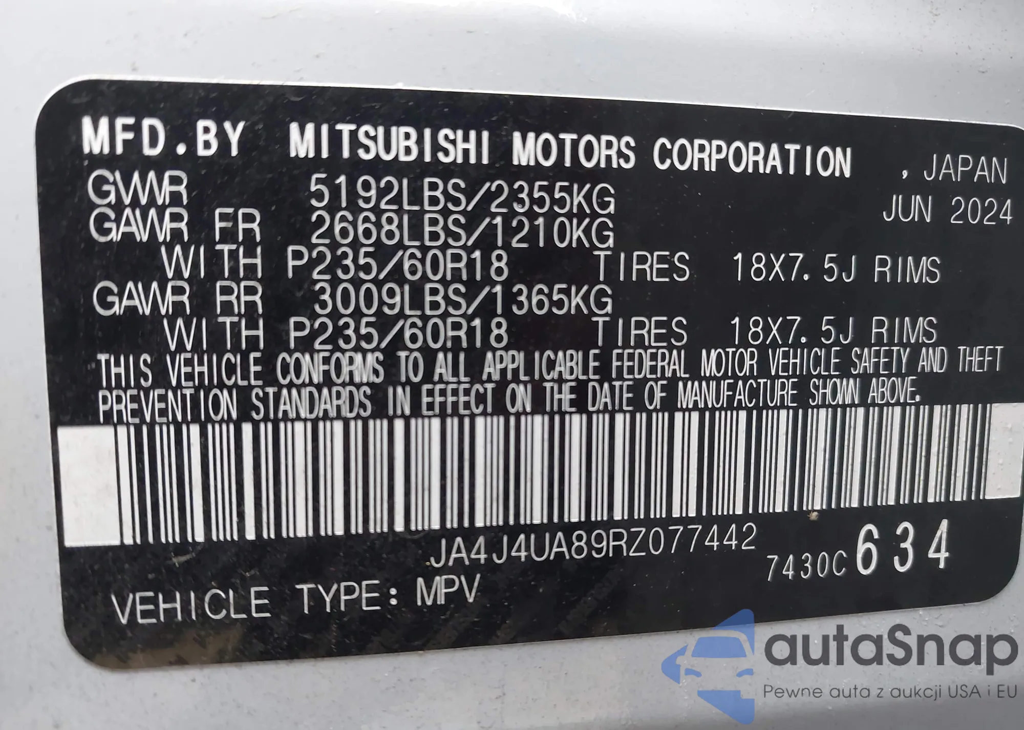 • VIN: JA4J4UA89RZ077442