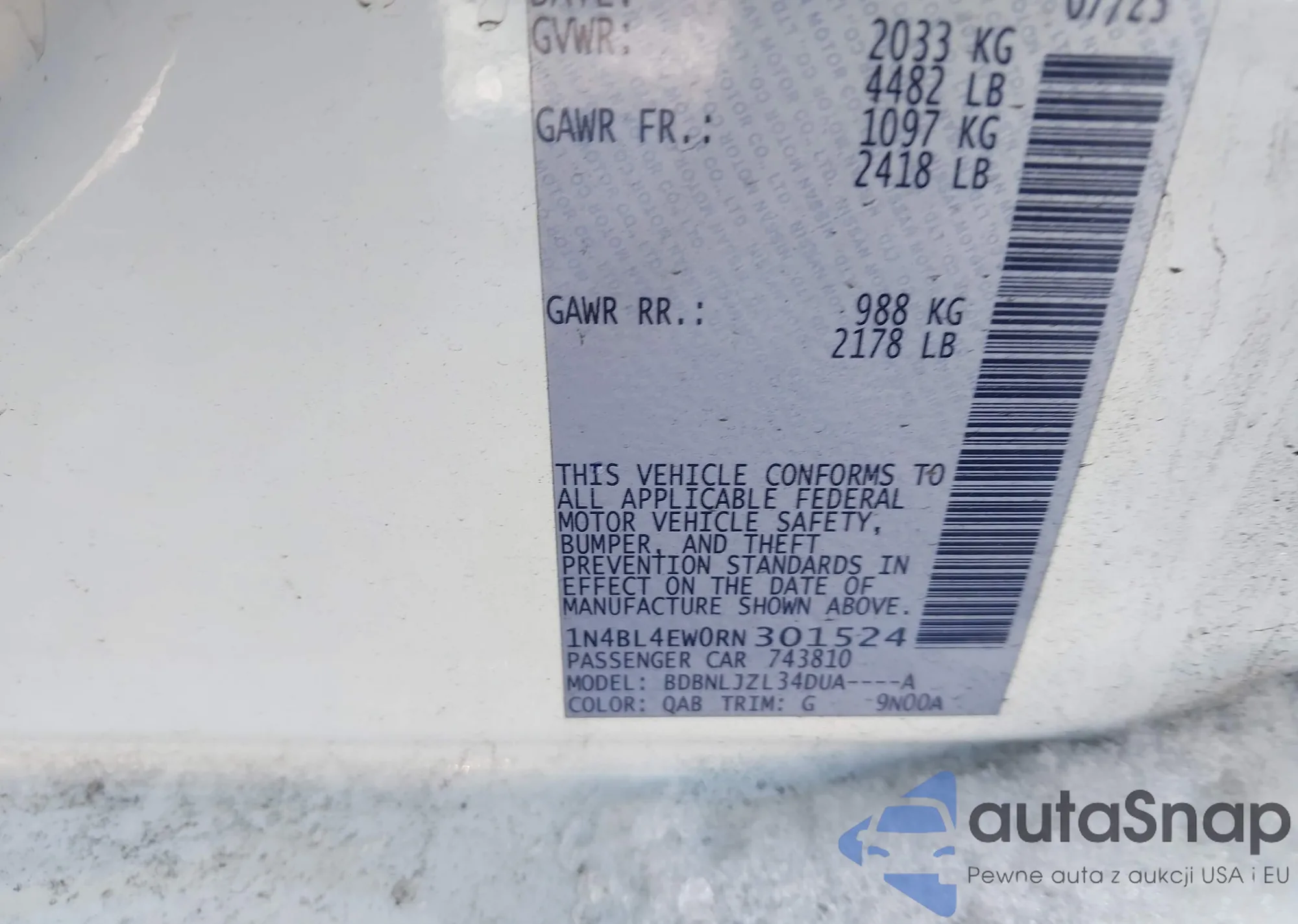 • VIN: 1N4BL4EW0RN301524
