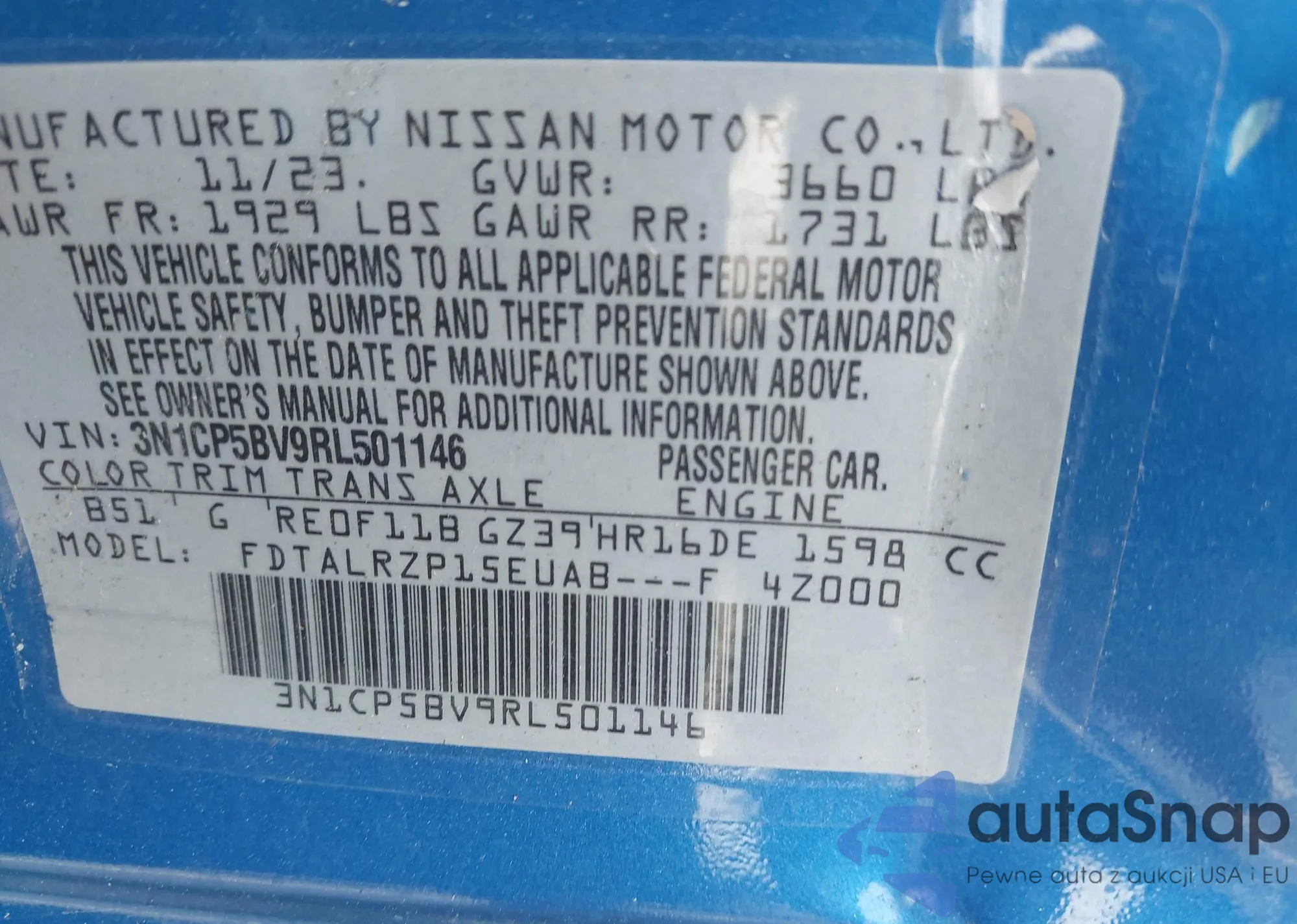 VIN: 3N1CP5BV9RL501146