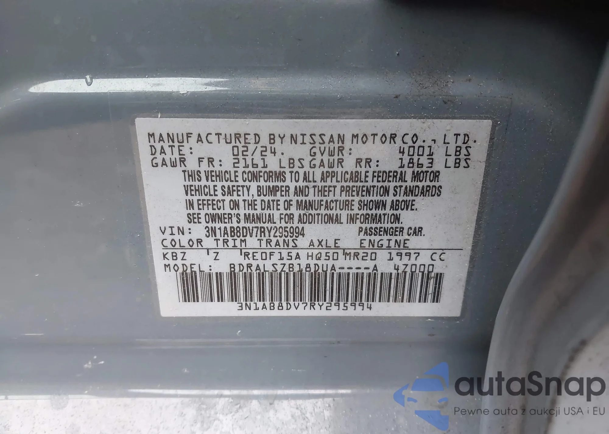 Samochód Nissan Sentra 2024 (VIN 3N1AB8DV7RY295994) nie był wcześniej licytowany. Dokumenty są czyste, przebieg odpowiada lub jest niższy niż średnia rynku. Sprzedaje go firma ubezpieczeniowa – polecamy zakup. Dostawa do portu zajmie ok. 6–8 tygodni.