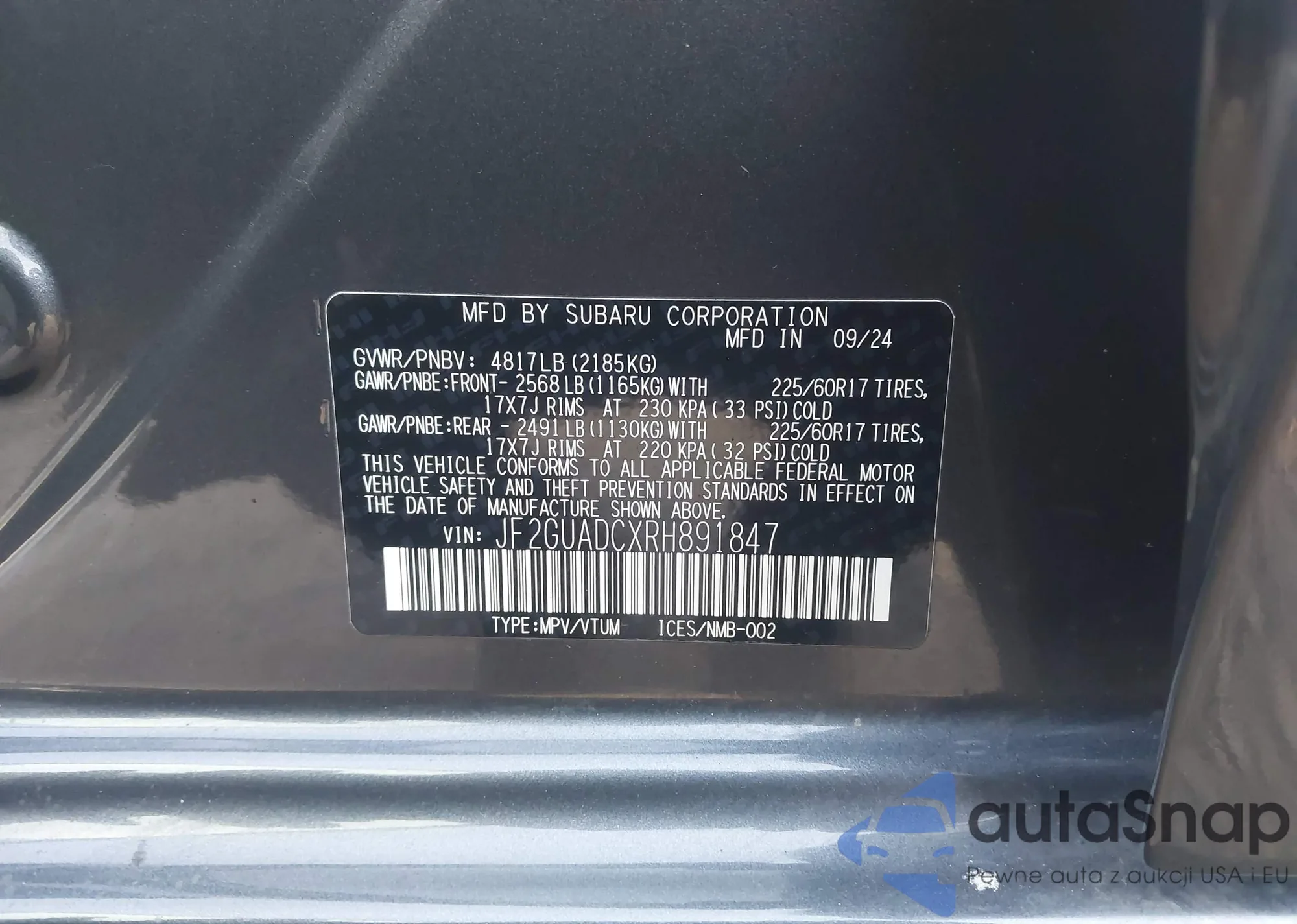 Samochód Subaru XV 2024 (VIN JF2GUADCXRH891847) nie był wcześniej licytowany. Dokumenty są czyste, przebieg odpowiada lub jest niższy niż średnia rynku. Sprzedaje go firma ubezpieczeniowa – polecamy zakup. Dostawa do portu zajmie ok. 6–8 tygodni.